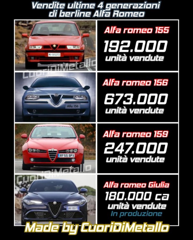 Difficile de comparer frontalement les 4: - Pas le même marché des SUV, ventes décroissantes pour toutes les berlines. - 2 carrosseries pour la 159, 3 carrosseries pour la 156. - La 159 est la seule a ne pas avoir eu de vraie version sportive. - La Giulia est la seule a avoir été vendue aux USA. - Stellantis a littéralement éteint la Giulia en supprimant beaucoup de motorisations et de configurations depuis déjà 2 ou 3 ans. |