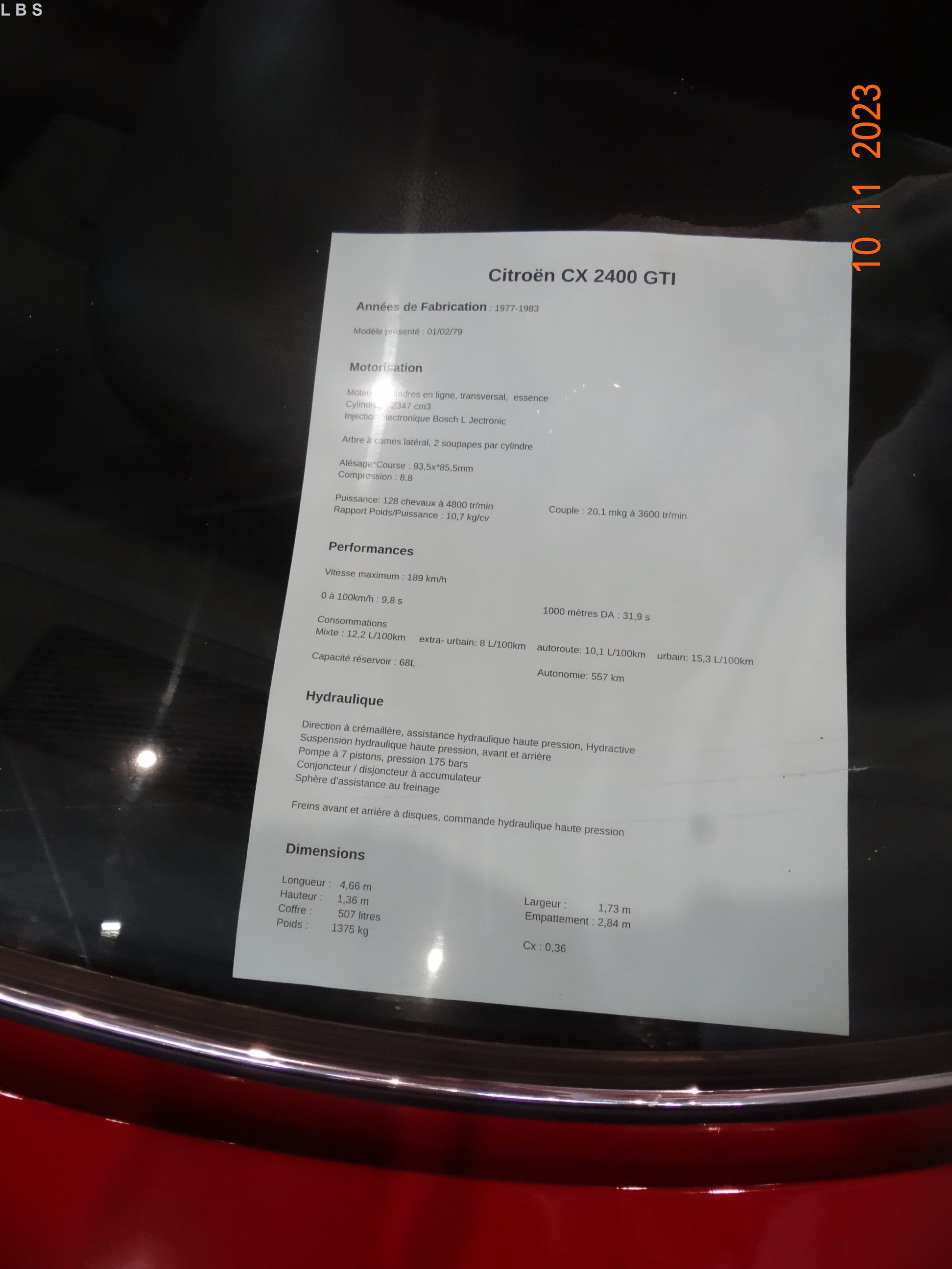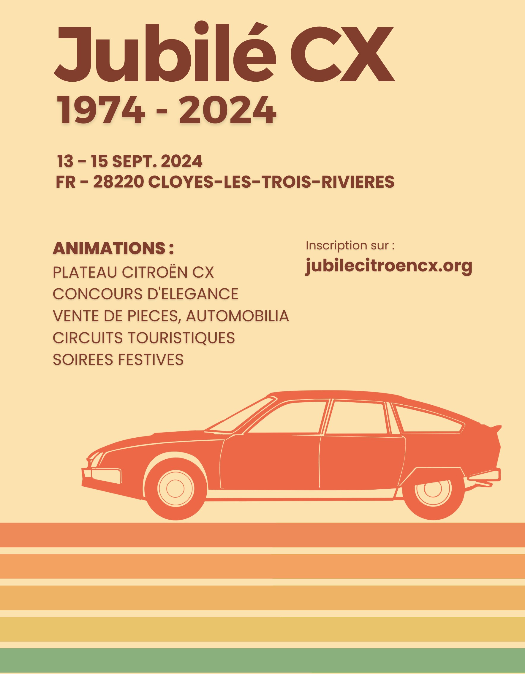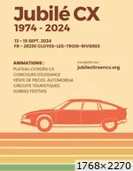 Bonsoir à tous Merci Pascal Salon époqu'auto 2023 .... .... CX 2000 .... CX 2400 GTI CX 2400 GTI "rouge massena" malheureusement flou......... (Photo du net) Voici une date à retenir : Le CX Club de France et L' Agence CX sont heureux de vous convier les 13, 14 et 15 Septembre 2024 au Jubilé CX, pour fêter les 50 ans de la Citroën CX ! L'événement se déroulera dans le magnifique Domaine de Montigny-le-Gannelon à Cloyes-Les-Trois-Rivières sous le signe de la convivialité. Bonne fin de soirée à tous |