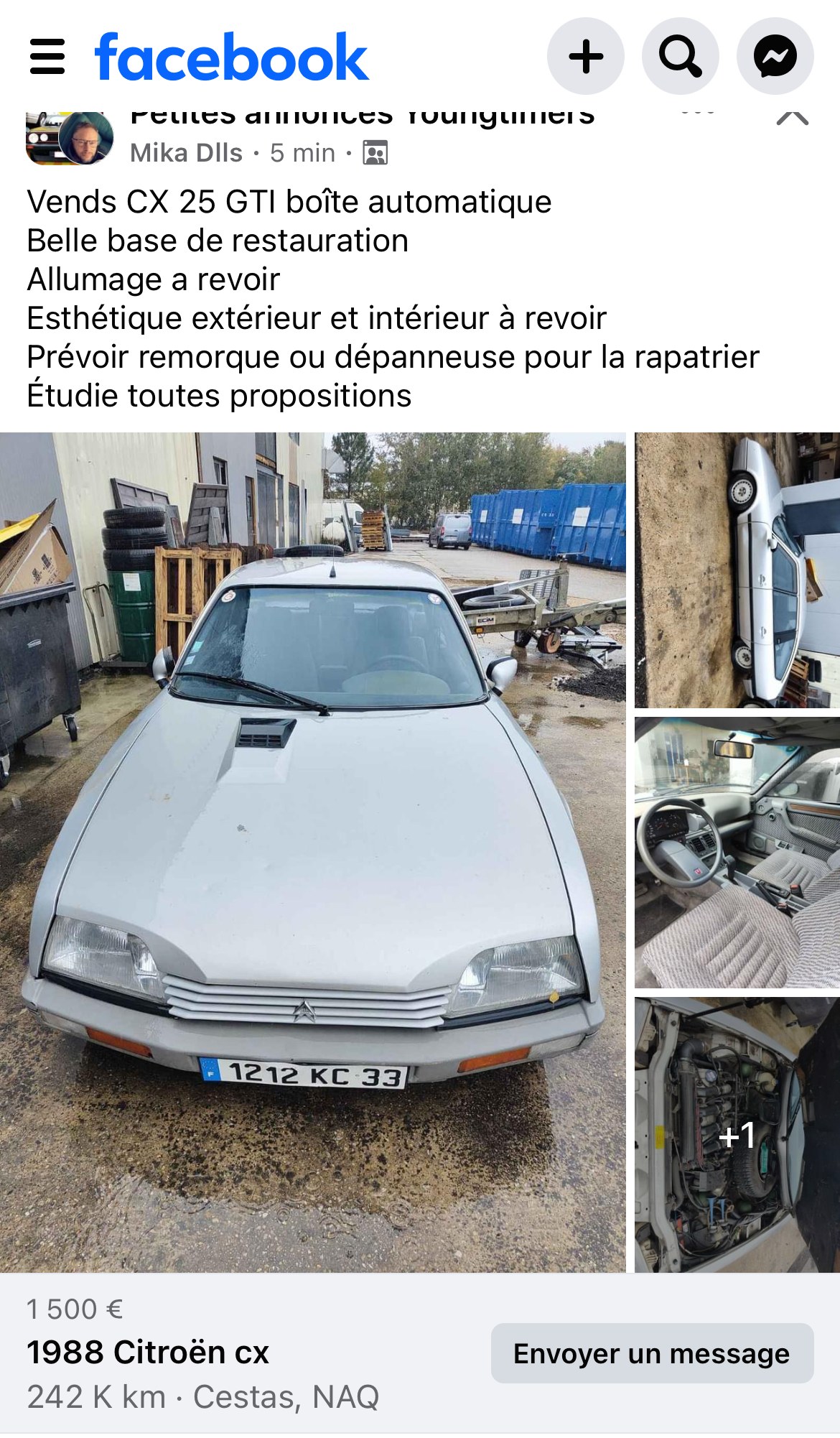 . On sait jamais, si ça intéresse quelqu’un vu la rareté de la chose d’occasion Vends CX d25 GTI boîte automatique Belle base de restauration Allumage a revoir Esthétique extérieur et intérieur à revoir Prévoir remorque ou dépanneuse pour la rapatrier Étudie toutes propositions Prix 1500€ (cestas en Gironde) ![]() |