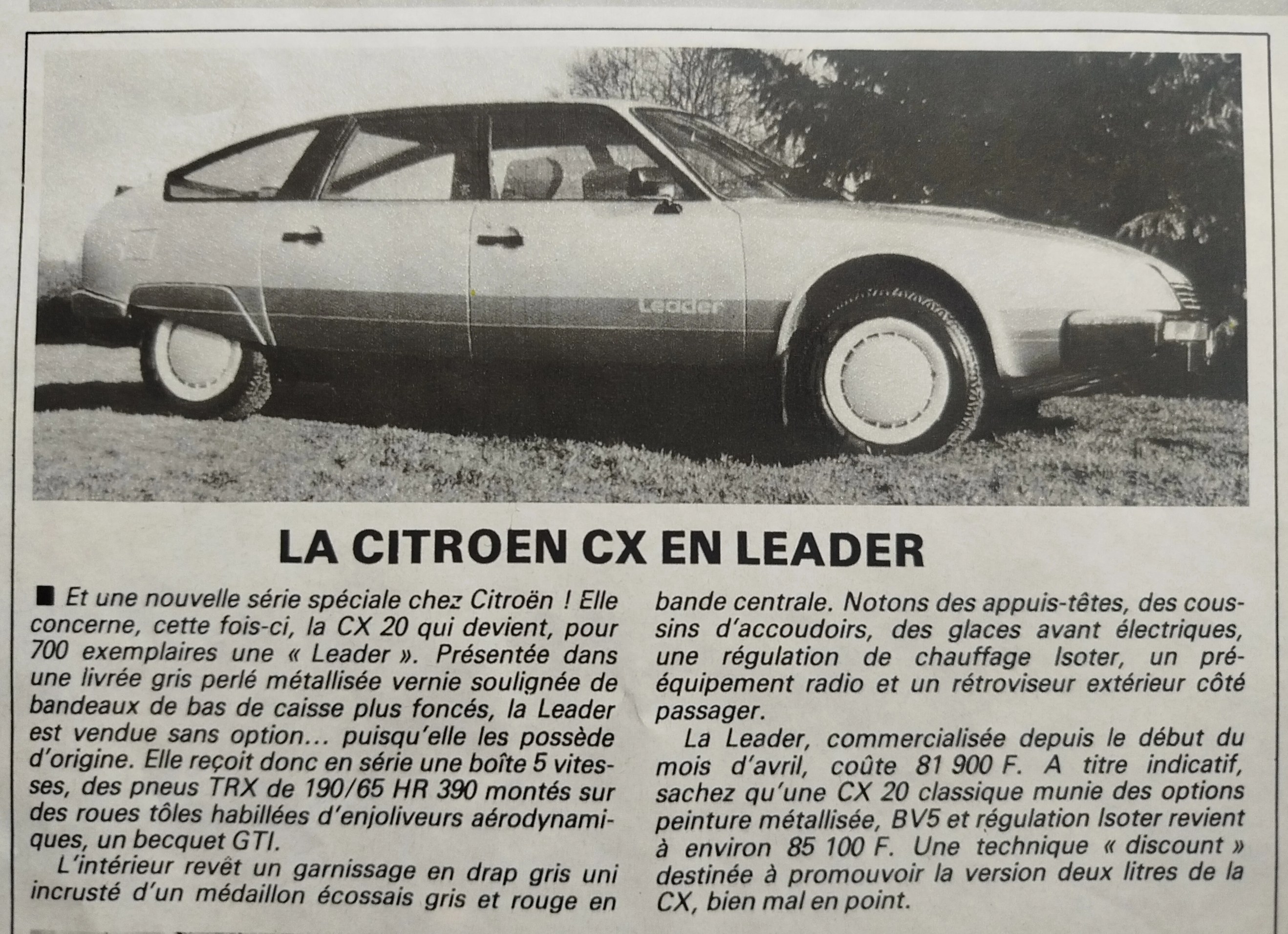 Non c'est vrai. Les séries Leader (Visa, BX et CX) ont été proposées sur le marché avec un prix d'appel, et l'on était dans une période ou les Séries Limitées incitaient à l'achat. Souvent équipées de sellerie ,de finitions et d'options que les modèles "basiques" n'avaient pas. Bon le cas des CX Leader était surtout d'écluser les caisses et tableaux de bord Série 1, comme indiqué plus haut dans un autre commentaire, la preuve en est que les S1 ont été proposées un millésime supplémentaire Ce qui devait être à l'origine une série limitée en 84....est devenue un modèle à part entière jusqu'à l'arrêt de production des berlines en mai 89, d'ailleurs, la dernière CX construite à Aulnay était une Leader 25D ( je possède des photos) |
