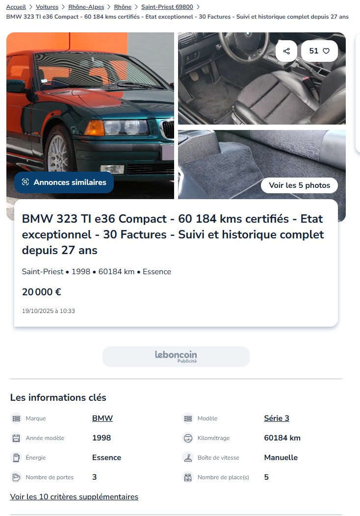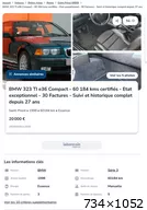 https://www.leboncoin.fr/ad/voitures/3073692971 (BMW 323ti e36 compact - Voitures) https://www.leboncoin.fr/ad/voitures/3049254523 (BMW 323ti E36 - Voitures) https://www.leboncoin.fr/ad/voitures/3060541851 (BMW 323 TI e36 Compact - 60 184 kms certifiés - Etat exceptionnel - 30 Factures - Suivi et historique complet depuis 27 ans - Voitures) Dernière édition le 09/11/2025 à 08:18 par thamomo007, édité 1 fois |