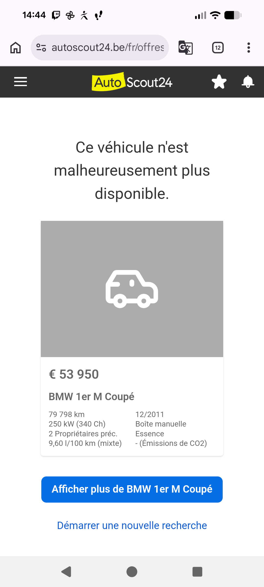J'ai trouvé cette annonce sur AutoScout24 https://www.autoscout24.be/fr/offres/bmw-1er-m-coupe-valencia-orange-first-owner-full-bmw-service-essence-orange-cd0851b7-6f7a-4ae8-8495-5cd756039441?utm_source=ios-share&utm_medium=copy_link&utm_campaign=share (BMW 1er M Coupé Coupé en Orange occasion à Herk-de-Stad pour € 64 900) Prix: € 64 900 Kilométrage: 76 330 km 1ère immatriculation: 05/2012 |