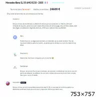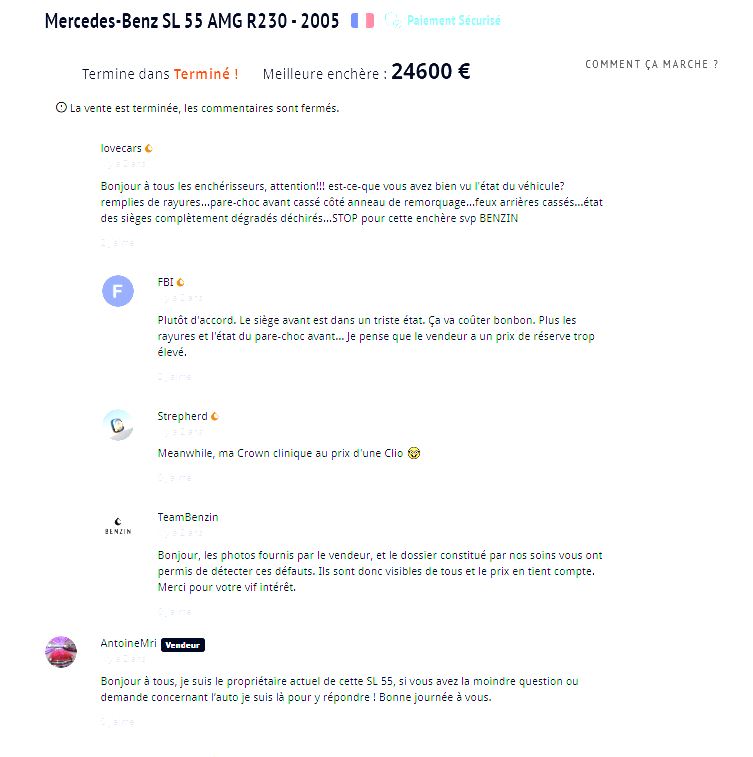 J'ai creusé un peu sur cette SL55, je suis tombé sur une petite vidéo sur youtube... On notera le côté très abile du photographe pour ne pas montrer le siège conducteur éventré. Cerise sur le gateau, elle a perdu 60k km https://www.leboncoin.fr/ad/voitures/3048219726 (Mercedes SL 55 AMG V8 Kompressor - Voitures) https://benzin.fr/auctions/show/sl-55-amg-r230-2005-64b7bced4e866 (Benzin - Mercedes-Benz SL 55 AMG R230 - 2005) |