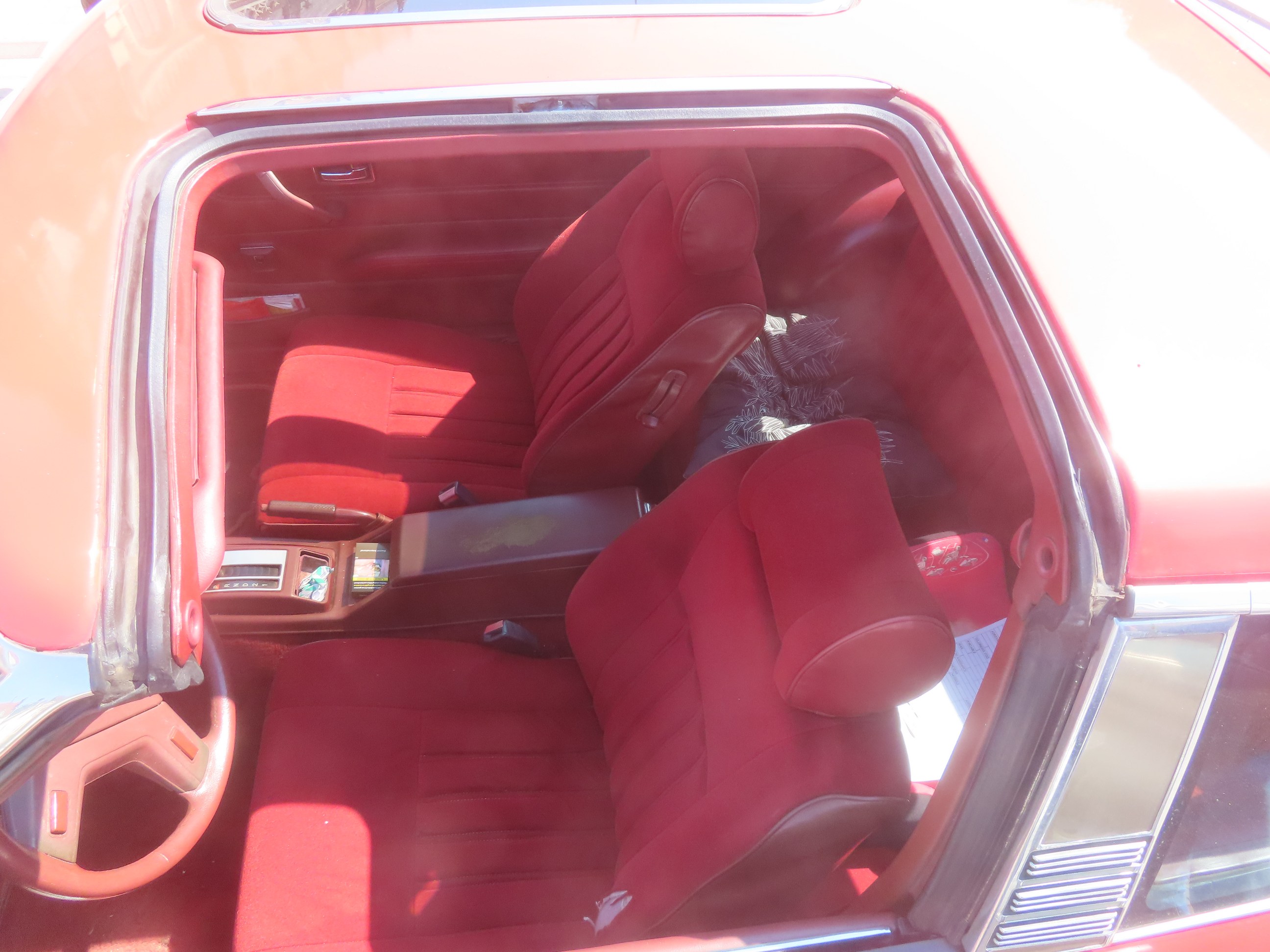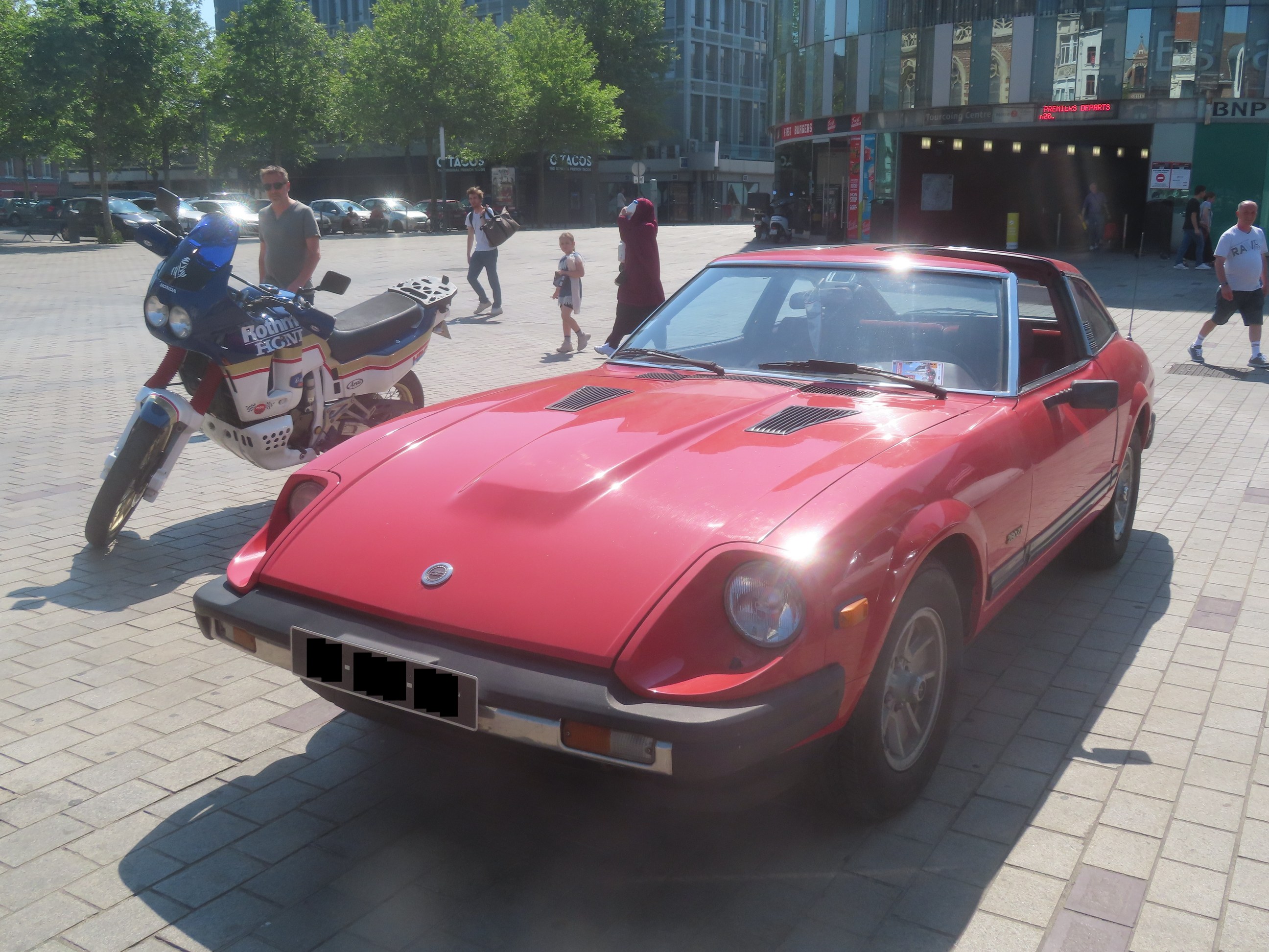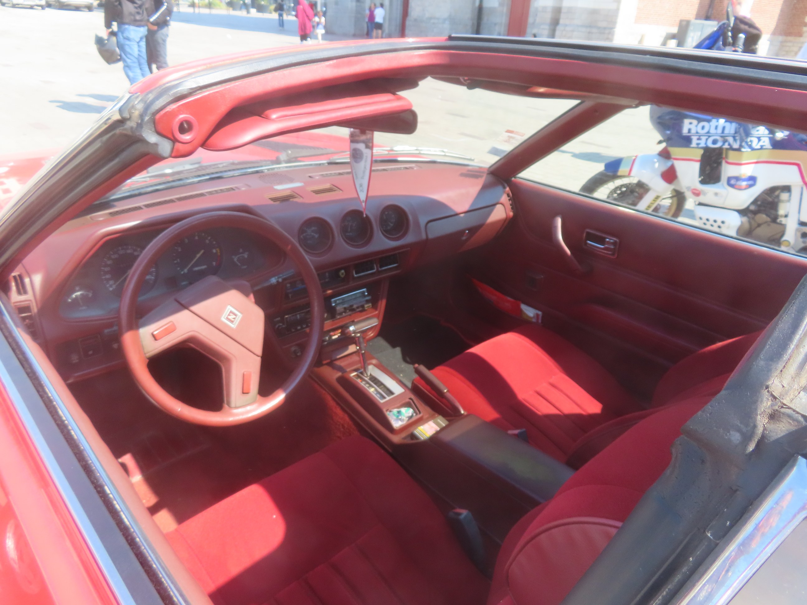 Une Datsun 280ZX BVA 1981 de chez Nissan (Tourcoing, le 11/06/2023): Un modèle US (les parechocs noirs, le T-roof..., j'imagine). Le proprio m'a indiqué que la 240Z n'avait de banquette AR. |