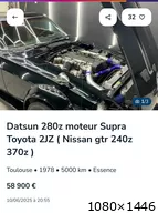 @caraddict Ça c'est pour toi, une petite Datsun avec un 2JZ Https://www.leboncoin.fr/ad/voitures/3005216940 (Datsun 280z moteur Supra Toyota 2JZ ( Nissan gtr 240z 370z ) - Voitures) Description Vends Nissan/Datsun Fairlady 280Z unique Prépa Moteur et boîte Toyota supra 2jz bi turbo par CXRACING aux usa Kit large Pneus semi slick neufs PROXXES Jantes Equip 40 Amortisseurs et freins neufs Triangles réglables neufs Géométrie complète effectuée Plus de 30ke de pièces : Embrayage renforce stage 4 exedy Admission sur mesure Gros intercooler greddy Dymp valve forge Ligne Echappement sur mesure Suspension réglable Freinage brembo Pompe à essence renforcée walbro Etc…. Ct ok Dors dans garage avec maintien batterie Donne système de réglage des turbo hks Kit complet de joint neufs Carte grise collection à mon nom 330cv à 0,8bars ( actuel ) 600cv à 1,5bars Marche déjà très très fort au vu du poids très léger Ce n’est pas un 240z à 40-50k euros , les 280z démarrent à 50k euros c’est donc un très bon prix car vente pour projet Immo . Échange possible |