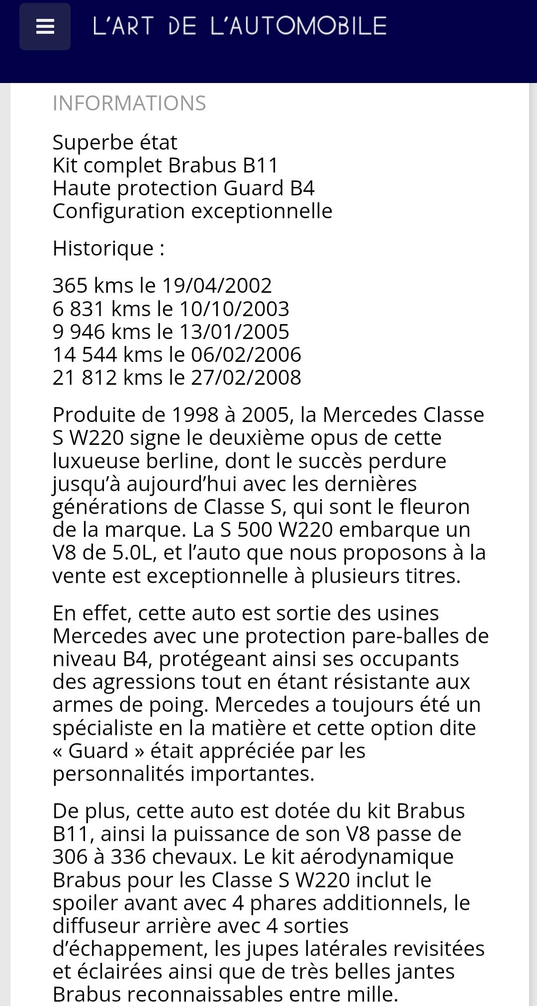L'historique est limpide en plus Toujours aussi pourri Lacentrale. Vu qu'il n'y pas de possibilités d'ajouter du texte, il manque les informations sur le blindage, la préparation, les options Designo etc... |