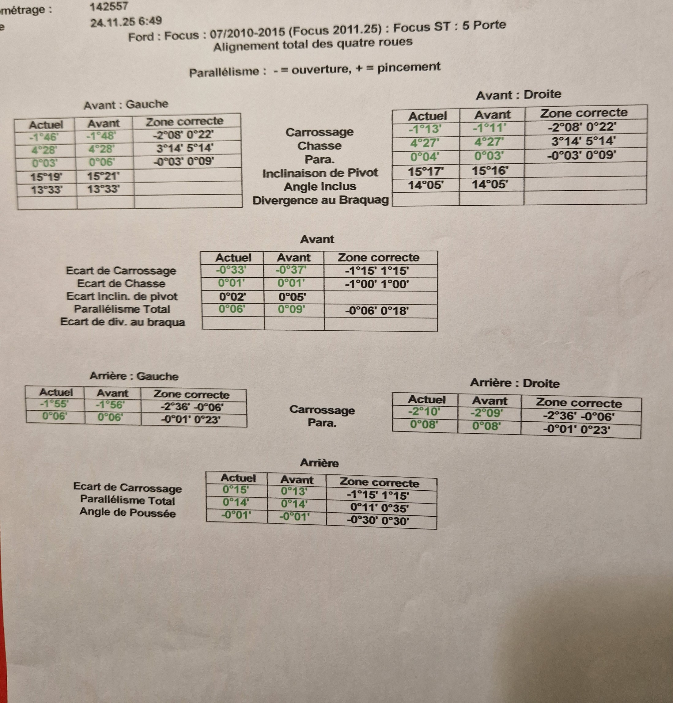 Une géométrie avait été faite avant le CT pour la vente; j'en ai refaite une après avoir mis la monte hiver dont les pneus étaient en bien meilleur état, résultat RAS tout est bon. ![]() |
