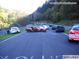 Citation de tf1 : « Crash au Nürburgring : 8 voitures impliquées et explications Cette photo montre la violence de l'accident qui a eu lieu dimanche dernier, sur le circuit du Nürburgring (Allemagne). 8 voitures ont été endommagées, dont le taxi officiel. Crash Accident Nurburgring octobre 2011 8 voitures ont été accidentés dimanche 2 octobre sur le circuit du Nürburgring Nordschleife. Explications. 1er état des lieux Lundi, le premier rapport de police fait état d'un accident sur le tracé du Nürburgring Nordschleife, célèbre piste de plus de 20 km très prisée des amateurs de vitesse, sur la portion en travaux appelée Bergwerk, "mine" en allemand. Une photo montrait quelques véhicules endommagés durant une session ouverte au public, sans beaucoup de précision. Que s'est-il passé ? Aujourd'hui, nous avons le récit exact de cet incident peu commun. Trois véhicules auraient ralenti subitement (de 200 à environ 50 km/h) à l'approche de la zone en travaux, ne laissant aucune chance à une quatrième ayant percuté l'avant d'une des voitures, allant dans l'herbe, puis revenant toucher les deux autres. Trois autres véhicules ont freiné à l'approche de la scène, mais la voiture officiel "Ring Taxi", une BMW M3, n'a pu s'arrêter à temps, et est rentrée dans le lot. BMW M3 CRT 2011 Voir les photos de la BMW M3 CRT Les voitures impliquées 8 voitures en tout ont été endommagées, et il y a du lourd. Hormis la BMW M3 et son V8 420ch, étaient présentes trois BMW M3 (générations E30, E36 et E92), deux Vauxhall VXR220 (Opel Speedster), une ancienne Porsche 911 GT3 et une Corvette C06. Déjà menacé, le Nürburgring, l'un des plus célèbres circuits au monde, ne brille encore pas par la sécurité en piste, non aidée par la longueur du tracé. » |