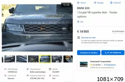 J'aime vraiment bien ça ... Je vais finir par faire un alignement de série 6 https://www.autoscout24.fr/offres/bmw-650-i-coupe-v8-superbe-etat-toutes-options-essence-argent-58aa7e05-87cf-4979-bb62-166914095b25?sort=standard&desc=0&lastSeenGuidPresent=true&cldtidx=2&position=2&search_id=vp0obue911&source_otp=t30&ap_tier=t30&source=listpage_search-results&order_bucket=unknown&new_taxonomy_available=false&boosting_product=mia&relevance_adjustment=boost&applied_boost_level=t30&boost_level=t30 (BMW 650 Coupé en Argent occasion à Lille pour € 14 900) ![]() |