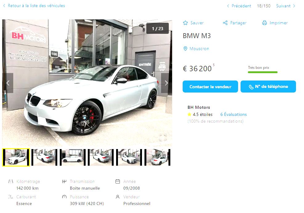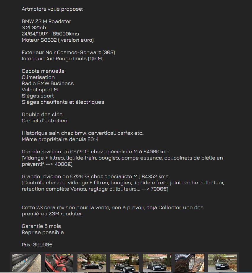 https://www.artmotors.fr/bmwz3m Elle a l'air très propre celle-ci, la restauration des cuirs (ou entretien) ca fait tout de suite la différence sur une annonce. Ici la mécanique, carosserie et intérieur, ça semble être un sans faute. ![]() Dernière édition le 04/12/2025 à 22:55 par seb62100, édité 1 fois |