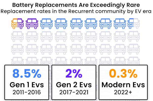 Des bonnes nouvelles pour l'électrique : les batteries durent plus longtemps que prévu il y a 10 ou 20 ans; et surtout leur durée de vie s'est régulièrement améliorée significativement. IndieEvs - The Facts Are In: You Shouldn't Worry About EV Battery Replacements RecurrentAuto - New Data: How Long Do Electric Car Batteries Last? * Unsurprisingly, the highest rate of battery replacements come from the very first generation of EVs on the road. These cars are now 14+ years old and were built on early technology. * Between 2015 and 2024, average battery sizes increased by 167%, meaning that newer EV batteries can stand to lose more capacity before they need replacement. * As battery management systems improve and we migrate to newer battery chemistries, we should see even better battery life and fewer replacements in modern EVs. |