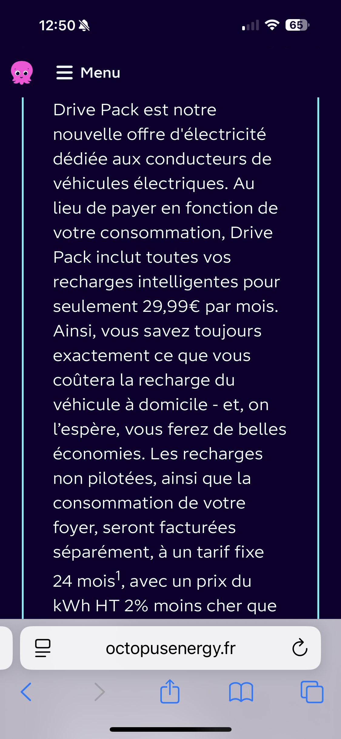 De nouvelles offres potentiellement intéressantes qui exploitent la fluctuation des prix de l’énergie et de tension sur le réseau Mais c’est bizarre de déléguer la recharge de ta voiture à ton fournisseur d’énergie, c’est lui qui va décider quand ta voiture charge en contre-partie d’une belle réduc (pour ceux qui roulent beaucoup) https://octopusenergy.fr/octopus-drive-pack (Octopus Drive Pack : roulez en électrique pour le prix d’un café ! - Octopus Energy France) |