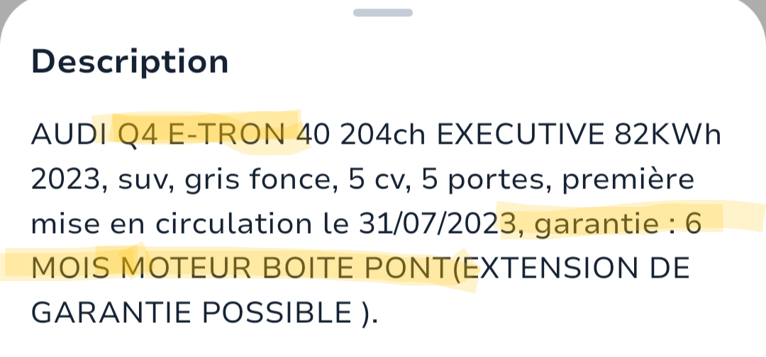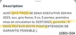 https://www.leboncoin.fr/ad/voitures/3104625809 (AUDI Q4 E-TRON 40 204ch EXECUTIVE 82KWh 2023 - Voitures) |