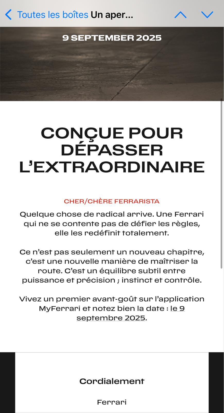 J’ai reçu un message de Ferrari Y’a quoi dans les tuyaux prochainement ? |
