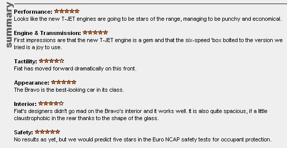Conclusion d'un bref essai dans l'A.J. du 1/02/07 : Spacieuse, pas désagréable à conduire, bien équipée et annoncée à un tarif plutôt attractif, la Fiat Bravo est réussie, malgré son confort un peu ferme et une finition qui mériterait plus de soin... Globalement : Design élégant, meilleure habitabilité de la catégorie, mais bonne position au volant dure à trouver et direction pas convaincante... |