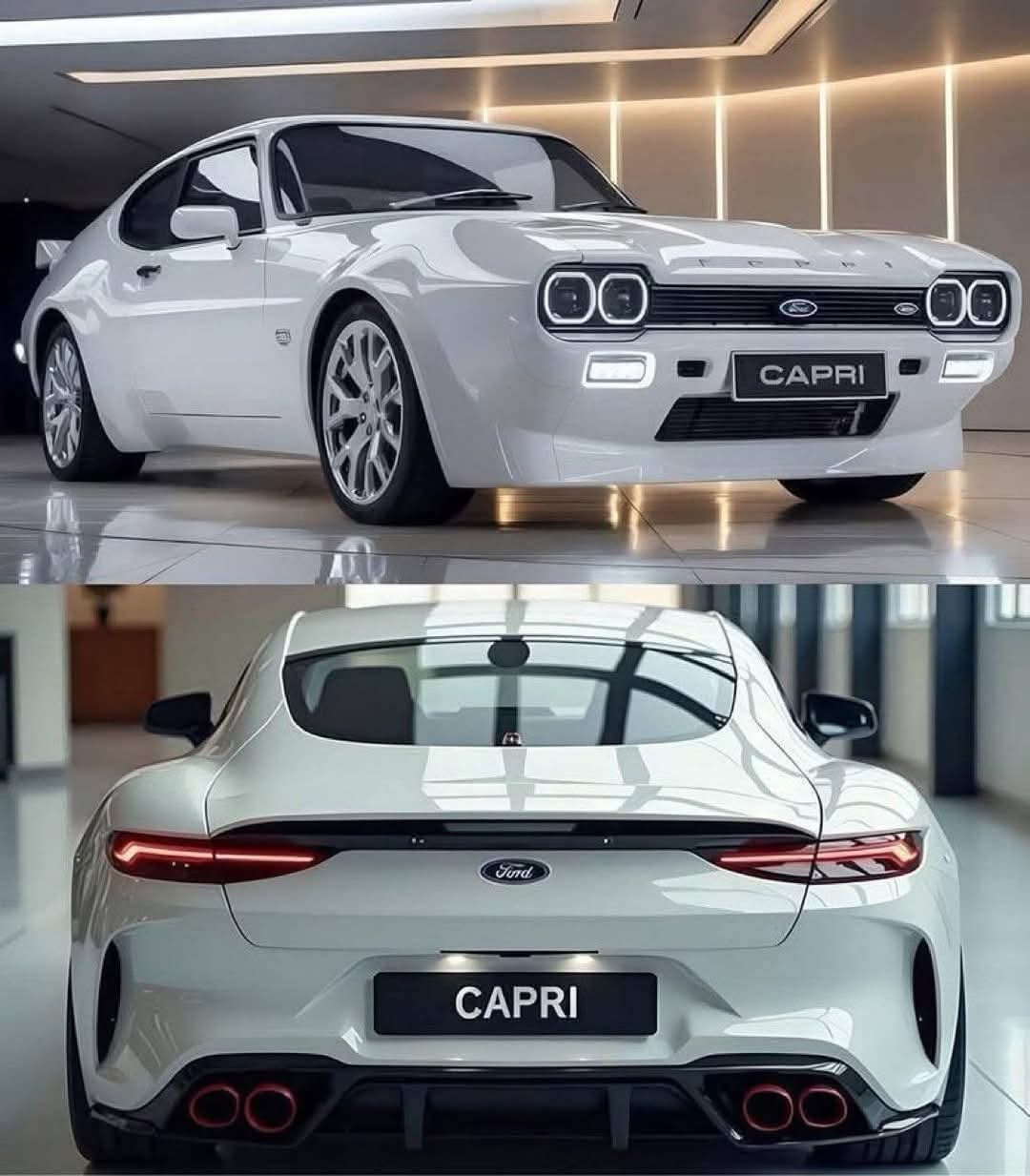 Le seul truc qui pourrait éventuellement faire référence à la Ford Capri, c' est la courbure de la vitre arrière. Mais il faut faire un effort de comparaison... Pas facile de mixer les deux silhouettes dans l' imaginaire! |