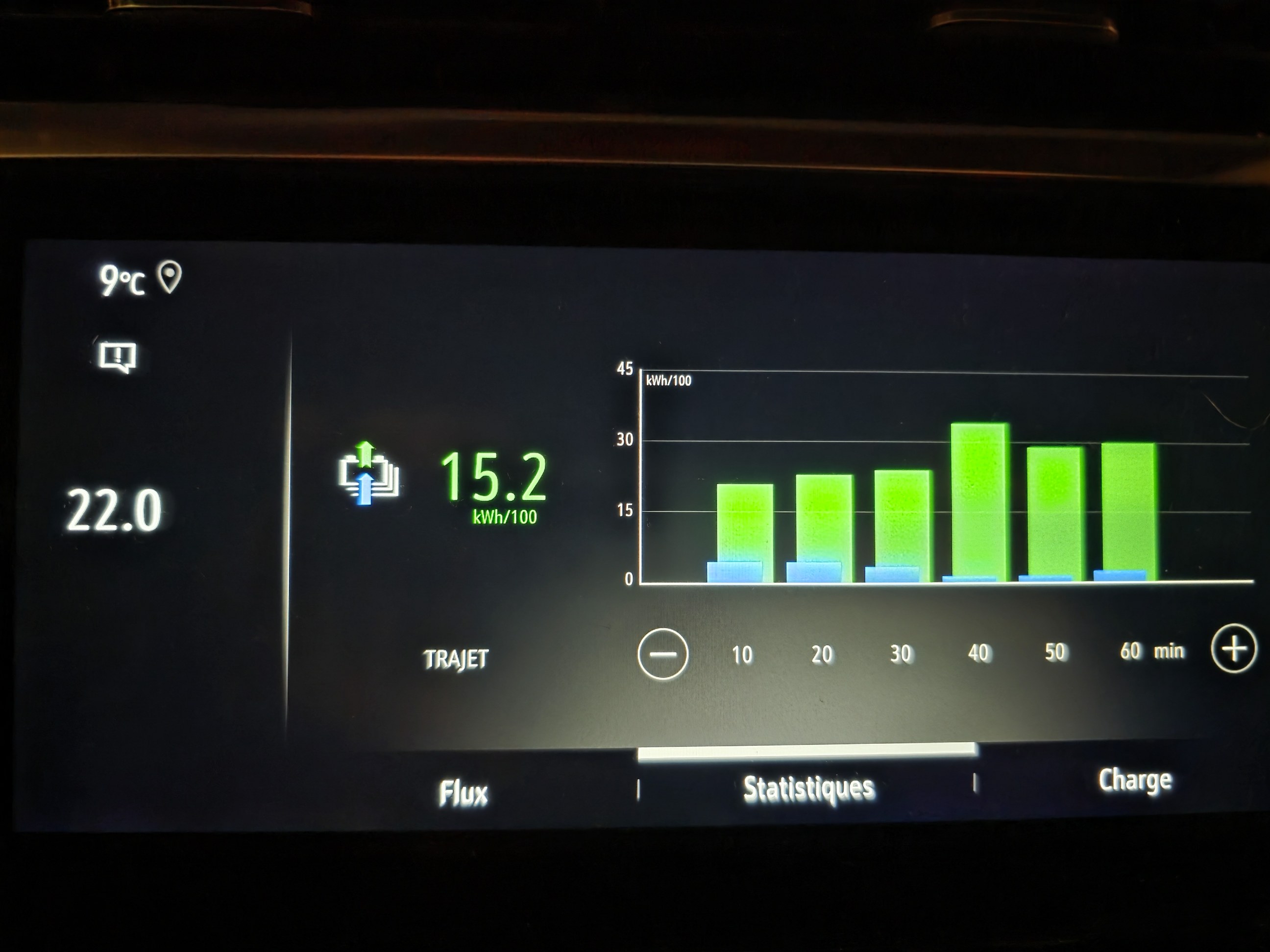 Comment c'est nimp ta pompe à chaleur Ceci dit vu le drame des consos, ca se trouve elle se désactive d'elle même et fait tourner le chauffage classique. Dans la i3 y'a les 2 systèmes, mais ca amrche en pompe à chaleur au moins jusque -7 - 10 degrés. Moi ce matin, 19kw/100 avec un léger préchauffage non branché à la prise. |