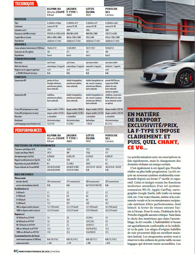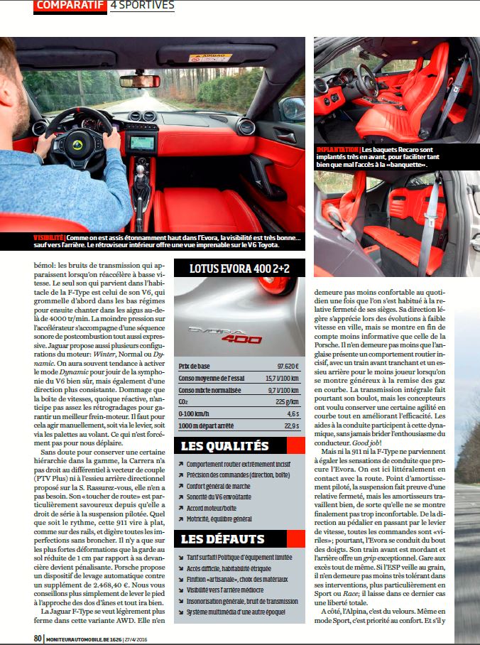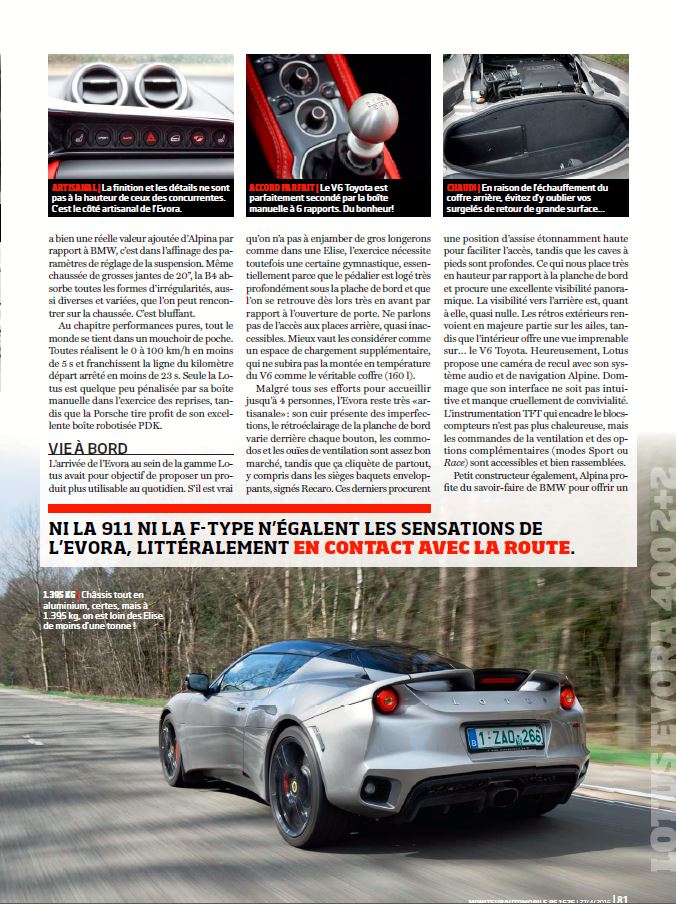Je viens de lire. Intéressant cet essai hétéroclite ! L'Evora est de loin la plus sympa à conduire il n'y avait aucun doute. J'aime énormément la Jaguar aussi dans la catégorie GT à moteur avant. Elle a un style fou, ça chante, et le dynamisme n'est pas oublié. |