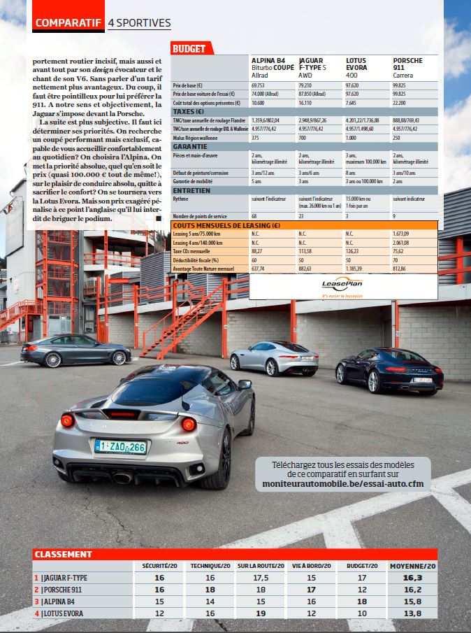 Effectivement je doute que beaucoup d'acheteurs aient hésité entre une série 4 coupé Alpina et une Evora Mais la comparaison est interessante tout de même bien qu'on pouvait deviner la conclusion de l'article a l'avance |