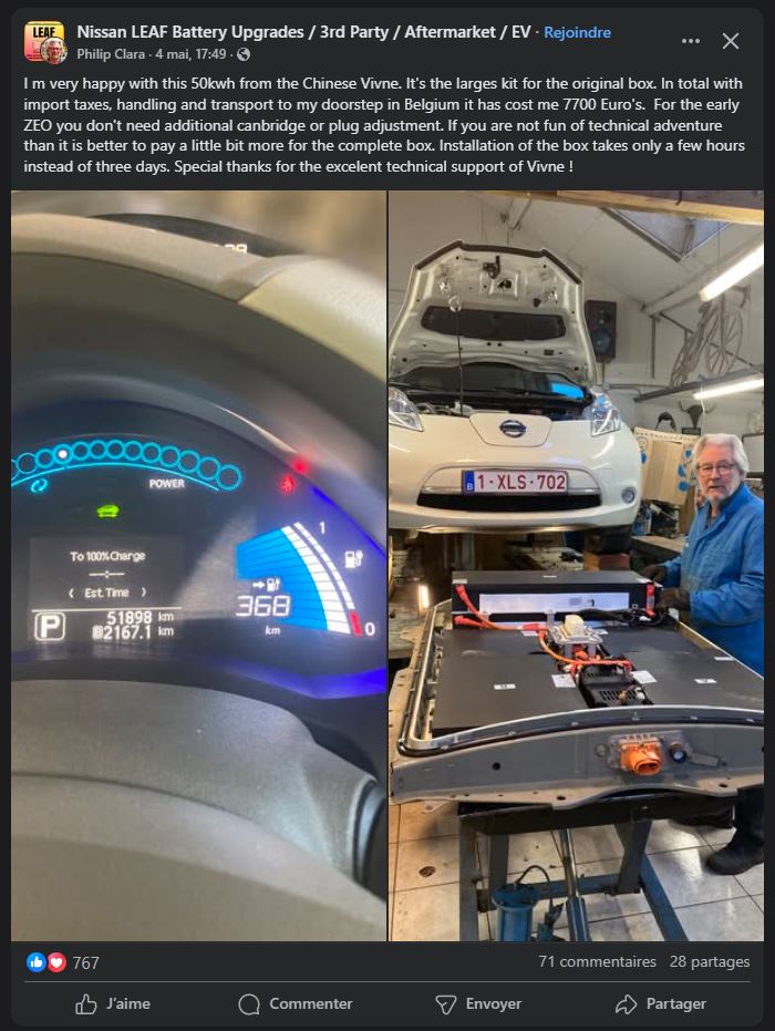 https://www.leboncoin.fr/recherche?category=2&u_car_brand=NISSAN&u_car_model=NISSAN_Leaf&fuel=4&horse_power_din=200-max&mileage=min-80000&sort=price&order=asc (Voitures d’occasion Toute la France - leboncoin) Si on cherche un VE pour faire 150-200km/jour et rentrer charger à la maison le soir, c'est un bon plan. |