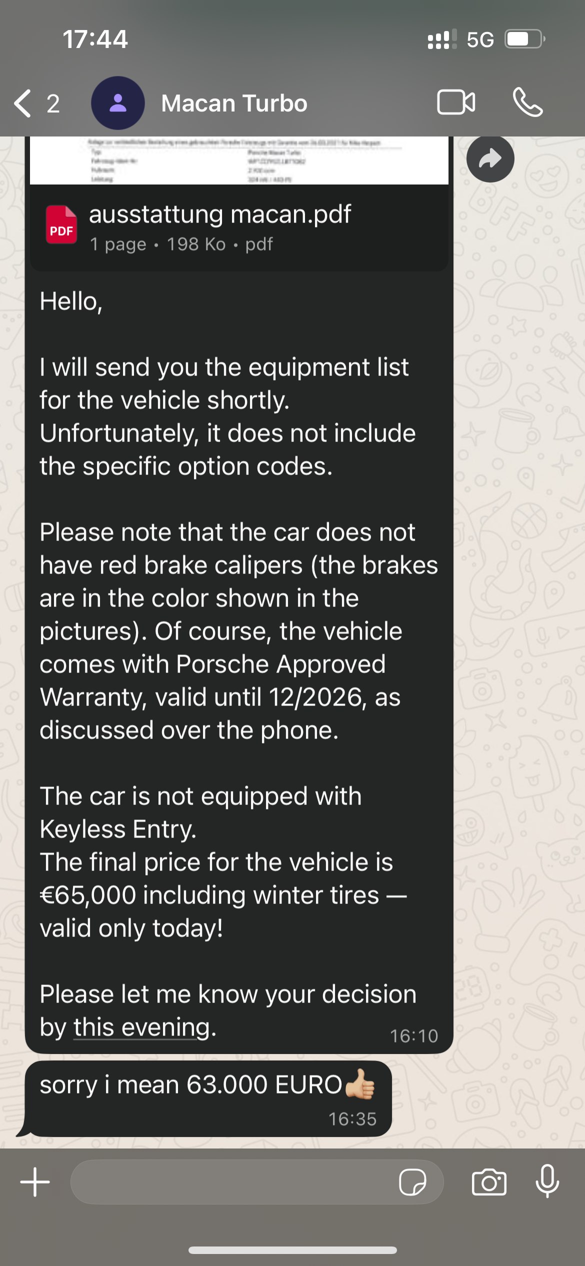 Le bleu miami vient d’Ukraine, no thanks. Plus je regarde le rouge, plus il me semble sympa. Je pensais que c’était un GTS mais c’est un Turbo. Pas de toit panoramique, ça a certains avantages (et inconvénients). La gueule que ça aurait dans le box à côté du 718 de la même couleur https://www.autohausherpich.de/fahrzeuge/porsche/porsche-macan/9229/ (Porsche Macan Turbo PDLS PASM SPORTABGAS AHK APPR.12.26) Dernière édition le 03/11/2025 à 11:43 par samolo, édité 1 fois |