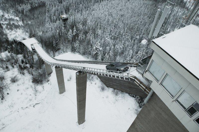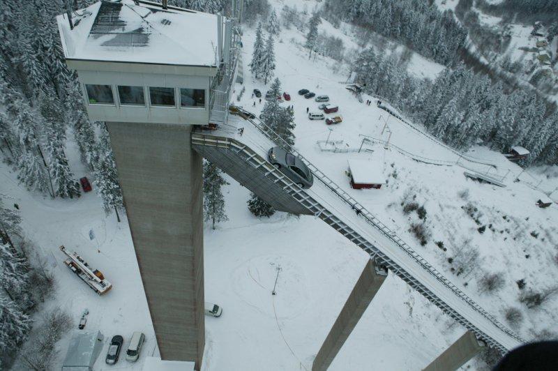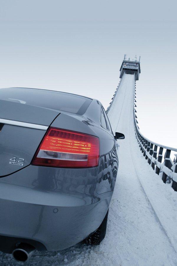 Sachez pour ceux qui veulent la video qu'elle était en projection à genève avec simulateur de conduite genre on est dans la voiture Voila, et effectivement la vidéo est impressionnante. Notez que arrivée en haut, la voiture s'est arrétée, elle avait certe des pneu neige, mais pas de chaines… Audi cherchait un moyen spectaculaire de venter les mérites de son système Quattro pour fêter le 25e anniversaire de cette technologie. Je pense qu'ils ont trouvé ... L'idée : Un ancien tremplin olympique de saut à ski culminant à 47 mètre avec une pente à 37,5° (soit environ 80%) : Une audi A6 4.2 Quattro : Ne sont-ils pas extraordinaires ? Et en plus ce n'est pas truqué. La voiture a bien réussi à monter. |