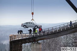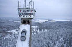 "L'idée du spot tourné sur le tremplin de saut à skis a vu le jour en 1986. Lors d'essais effectués sur un glacier au Tyrol, l'Audi 100 quattro avait escaladé une rampe à 39 degrés. Avec ses 37,5 degrés, autrement dit une déclivité de 80 pour cent, la montée au tremplin de Kaipola, en Finlande, représentait un défi à peine moins ambitieux. Une grue plaça la voiture sur le plate-forme du tremplin où l'attendaient trois dispositifs de sécurité : un câble d'acier soigneusement dissimulé, un système de freins placée sous la partie avant et un filet de protection sur la plate-forme. Pour le spécialiste des rallyes Harald Demuth, qui avait déjà piloté la quattro, ces dispositifs relevaient du superflu : il conduisit l'Audi 100 quattro sur les 78 mètres de la montée, lui faisant remonter la rampe par ses propres moyens en toute simplicité avec pour principal handicap une visibilité réduite puisque le nez de la voiture était tourné vers le ciel." source http://www.audipassion.com/univers_audi/actualites/2005/25_quattro/quattro_emotion.php |