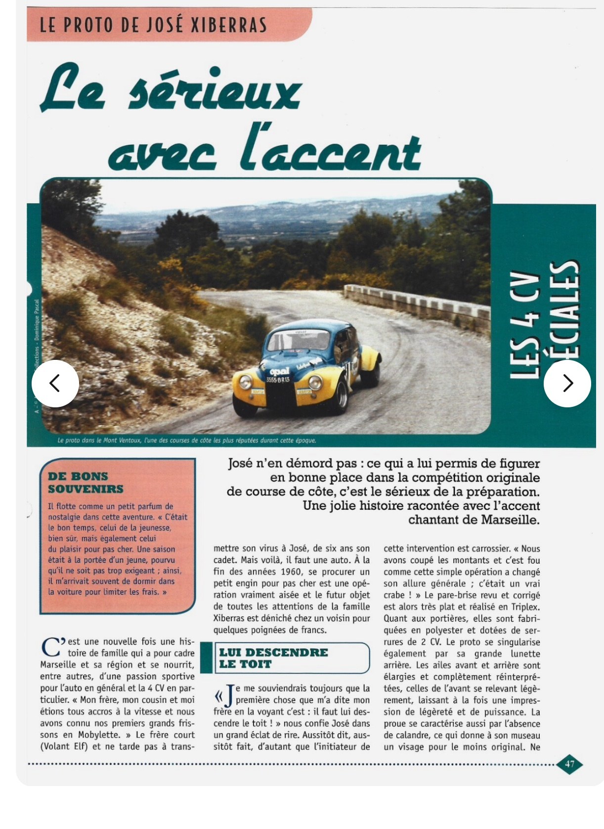 [citation]Citation de balivernes : « Citation de JPD : « Citation de balivernes : « @balivernes Je peux me permettre de vous dire qu'un collègue de lycée en 1969/72 a fait un proto 4cv avec un moteur de R12 en position centrale donc boite retournée (comme sur les Martini de Prost et Pironi que j'ai bien connus en Formules Renault) . Centralisé le poids d'un proto ce n'était pas chose connue à l'époque... Mais Ca, c'est du pur passé. J'ai montré des photo ici.... Je retourne à ma visseuse dévisseuse » @JPD Tu l'as montrée il n'y a pas longtemps et je me demandais si tu l'avais en couleur. Faite par un "gamin" de lycée je trouve que c'était un travail abouti, une belle auto. Tu avais participé ? Allez, je t'autorise à retourner à ta "vice - des vices" ..... Si tu en es à tout installer le moral doit être meilleur, non ? Bon courage à Françoise et à toi Jean-Pierre. » @balivernes oui, elle était Bleu France sans pub. Philippe Leroy qu'il s'appelait ! Son père avait une station service avec un garage et un petit chateau derrière dans un parc. Il a repris l'affaire apres ses études puis s'est fait embaucher chez Renault pas loin à Cléon tout en gardant la station que sa femme a géré. Au bout d'un moment il est devenu pilote essayeur au Centre à Aubevoye. Il a planté son proto dans un virage au bout de 3 courses. peu d'essai, pas de maîtrise, trop foufou ! enfin c'est mon avis. Je vais rechercher les photo mais je ne suis pas sur le bon mac Retour au vissage et revissage. Je suis en train d'installer 2 portes coulissantes coordonnées, mais de ça vous vous en moquez et vous avez bien raison. Par contre j'ai redessine un plan de travail.... vous m'en direz des nouvelles. Miniaturisez bien! ca me fait des vacances JP |