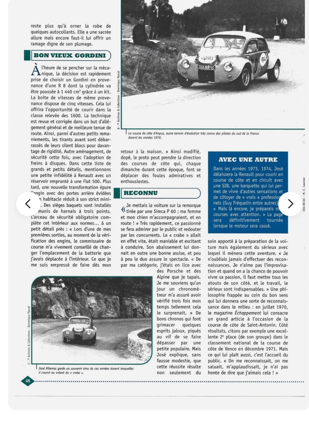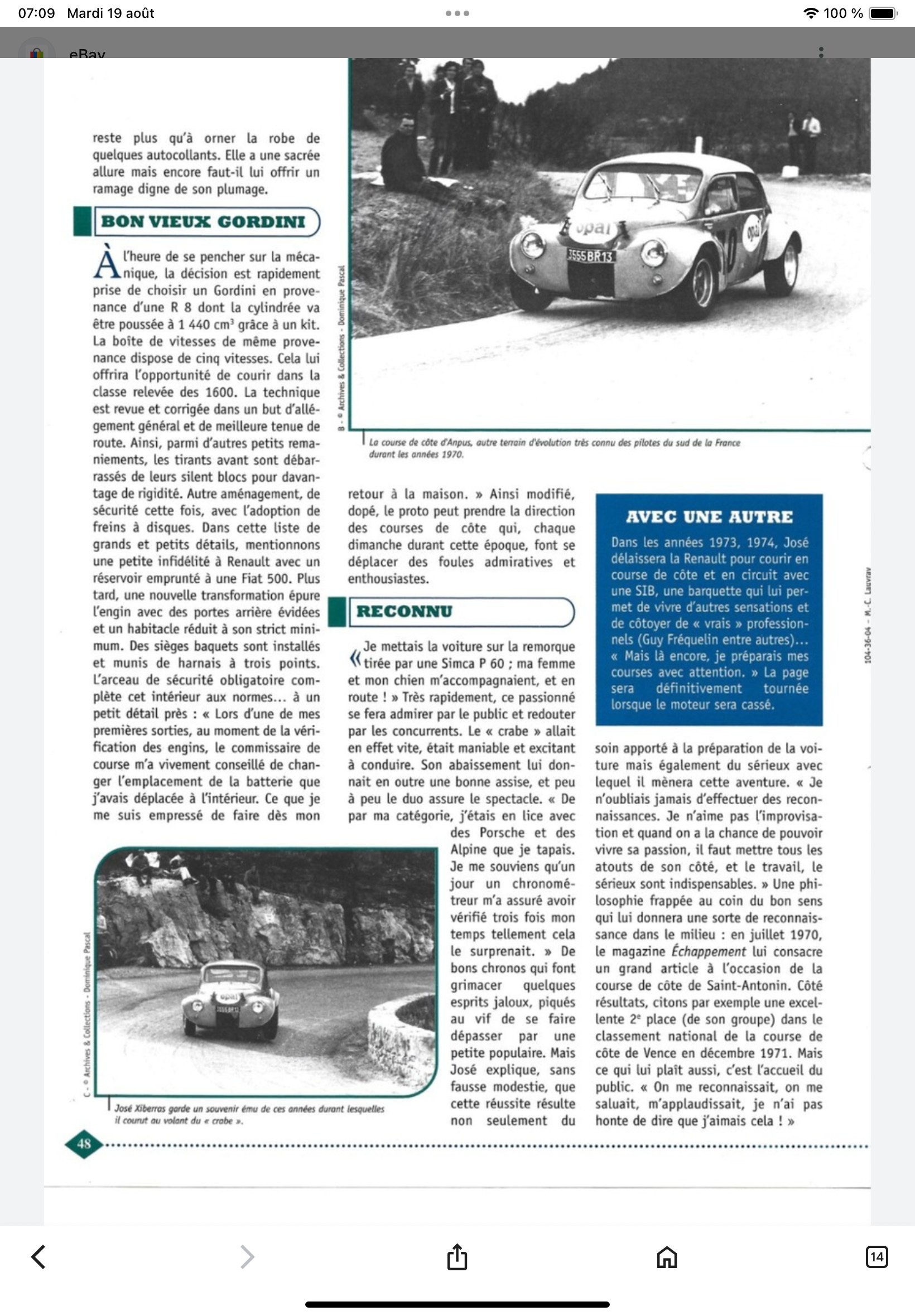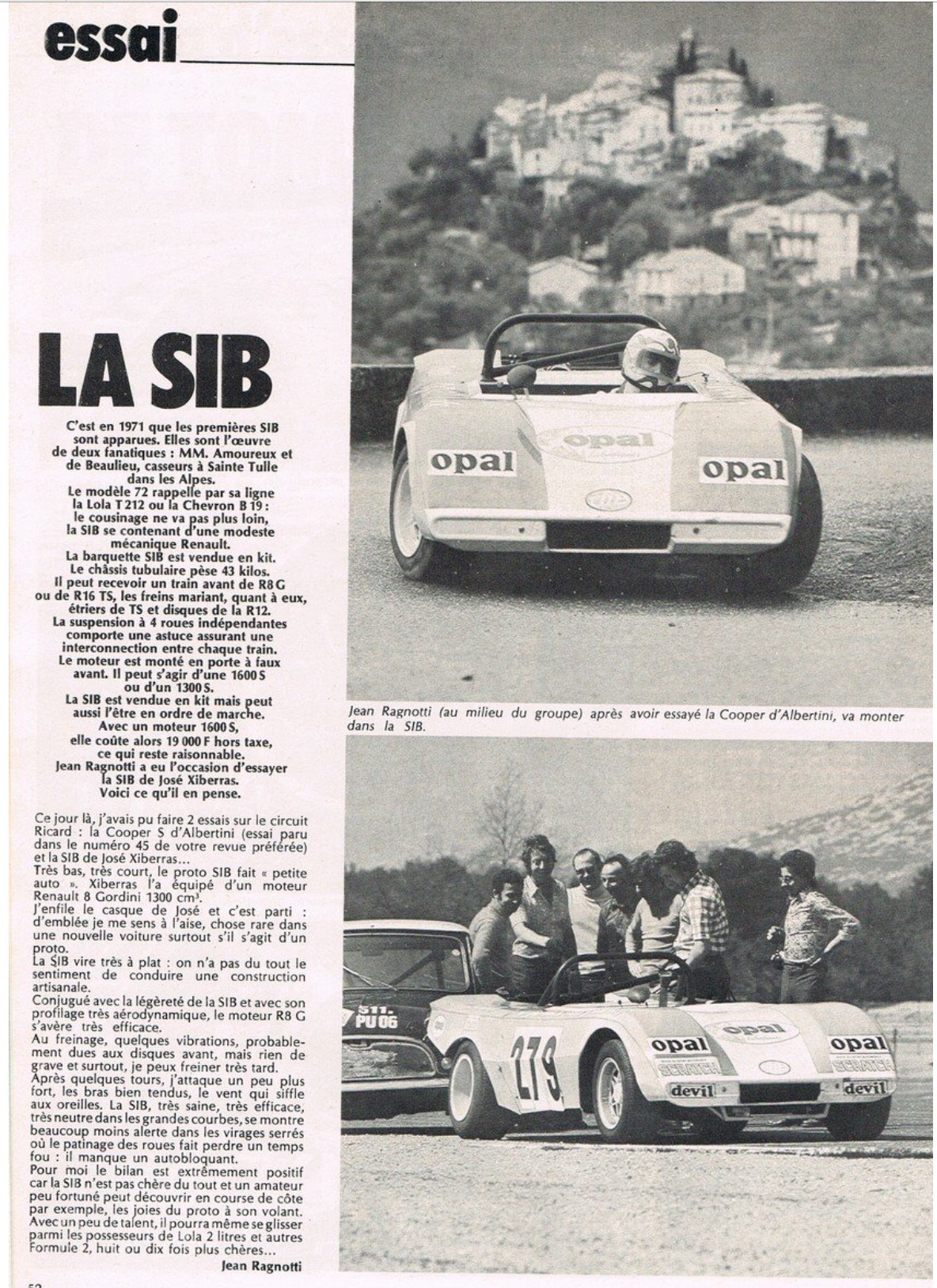 Citation de rallyeroland : « @efbe Cette auto m’interroge car on lit de tout ( et c’est bien, on se creuse les méninges) Je sais que cette barquette a mécanique Renault a existé en Simca. Une autre photo le prouve bizarre très ressemblante Merci Franck pour cet article qui me fait remonter en mémoire notre visite chez Barraquet père en 2015 avec le fils au TDCH. J’avais vu sur son buffet une photo de cette auto et j’imaginais SIMKIT puisque Fred a fait beaucoup pour Simca. J’ai encore en mémoire une de ses anecdotes : « a une course de cote, les Corses ont été surpris par la tenu de route de mes nouveaux pneus. Ils ont bloqués mon auto en me disant : tu ne repars pas ce soir, demain on essaye ton auto . C’est ce qui est arrivé 😂. Il n’a pu prendre le bateau pour retourner sur Marseille que le lendemain » [b]Citation de piukinen : « Piukinen @ roland, @efbe Cette barquette fabriquée par Mr De Baulieu dans les Basses-Alpes était dotée de train R8 Gordini de même que le moteur. (deuxième version de la SIB). voir la première en pj Elle a évoluée en s'appelant SIMKIT avec un moteur Simca. Elle a même eu droit à un JRD pour la coupe simca shell( un peu élargie il est vrai). Elle a couru en rallye avec notamment André Pascal de Rosans (05) , Bontoux du 13 et d'autres encore. Elle était immatriculée en "proto". Il en reste quelques unes qui roulent en côte et en circuit historique. Mr de Beaulieu m'a offert son support moteur qu'il utilisait pour ses moteurs gordini. Ah, s'il pouvait parler.... Voilà, je me suis lâché! Une voiture de course fabriquée dans mon département, il n'y en a pas eu beaucoup! Rassurez-vous, j'ai fait celle de Bontoux (en carton quand j'étais plus jeune) , mais un kit se profile si je me résous à m'y remettre.... »@piukinen Citation de piukinen : « @ roland eh , oui, je viens de voir que j'avais fait ça en 1975: carton+ mastic: là , à ce jour j'espère bien sortir un petit kit avec le 1300 gordini de la 4cv et pourquoi pas la simkit avec le simca de roland. »@piukinen et Roland Comment une interrogation (Renault ? Simca ?) amène à une vraie découverte - tout au moins pour moi car elle ne m'a pas attiré spécialement alors. Epoque bénie des constructeurs sans patente .... Pas plus surpris que ça que tu puisses apporter autant de docs François, ta réserve de revues et tout et tout m'avait frappé. Ce qui m'épate davantage c'est que tu arrives à les ressortir aussi vite et aussi richement. Mais c'est pas tout, tu sais bien nous surprendre, encore une merveille à ton actif : si tu décides d'en faire un kit tu as d'ores et déjà un client ! Voilà, Roland a trouvé un nouveau filon pour placer ses mécaniques Simca ..... Dernière édition le 30/08/2025 à 11:17 par balivernes, édité 2 fois |