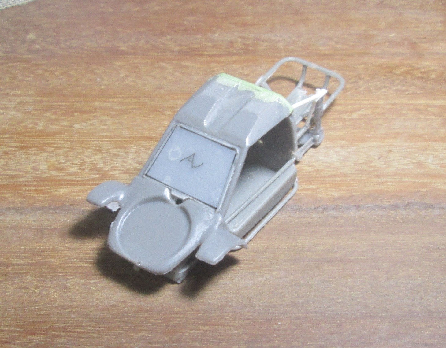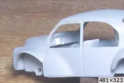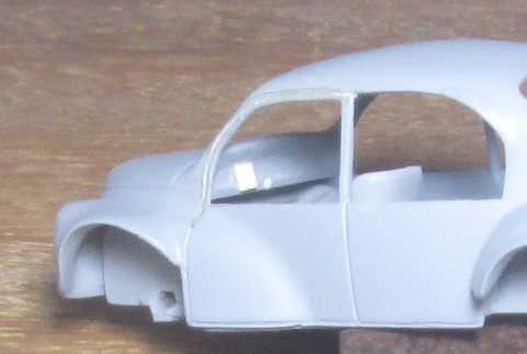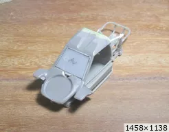 Exemple de ce qu'il ne faut pas faire ! J'ai attendu d'avoir passé de l'apprêt sur la carrosserie Opal, pour graver les jeux de portes AV. L'apprêt même bien sec risque de faire des éclats. L'idéal est de le faire avant, sur la résine. Illustration : Le principe est bon, mais je ne suis pas arrivé à le faire parfait. Acceptable sans plus. Dans ce cas de toutes façons la matière à graver n'était pas homogène, il y avait des retouches de ALF, c'est pourquoi je l'ai tenté comme ça. Bon, pour quelqu'un qui a un peu d'expérience ça tombe sous le sens mais j'ai toujours la faiblesse de croire qu'il peut y avoir des personnes moins expérimentées qui lisent ces lignes ..... |