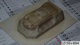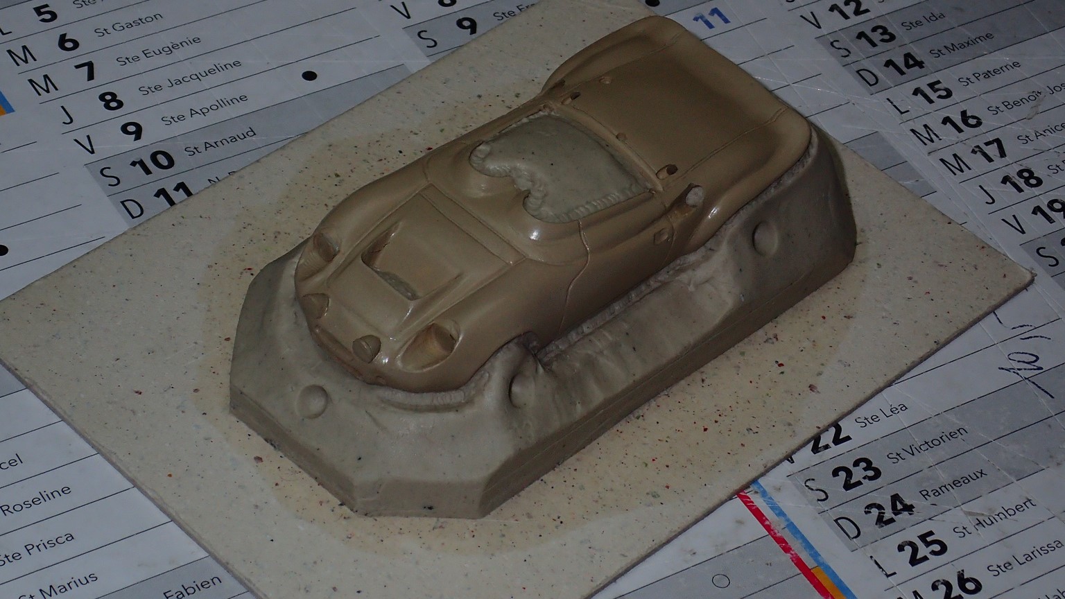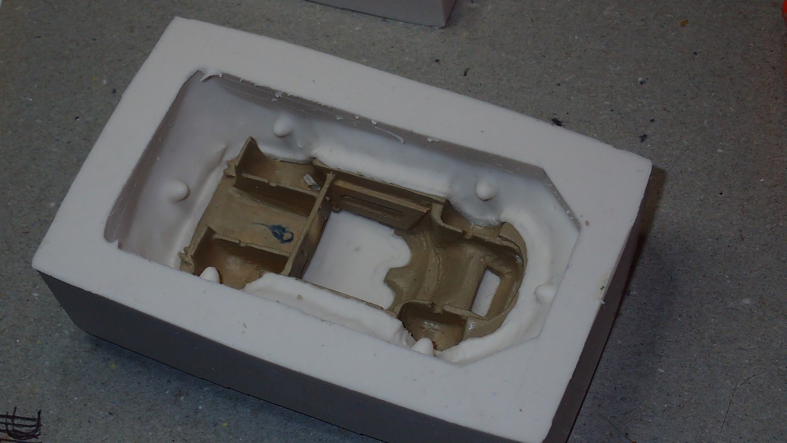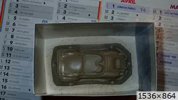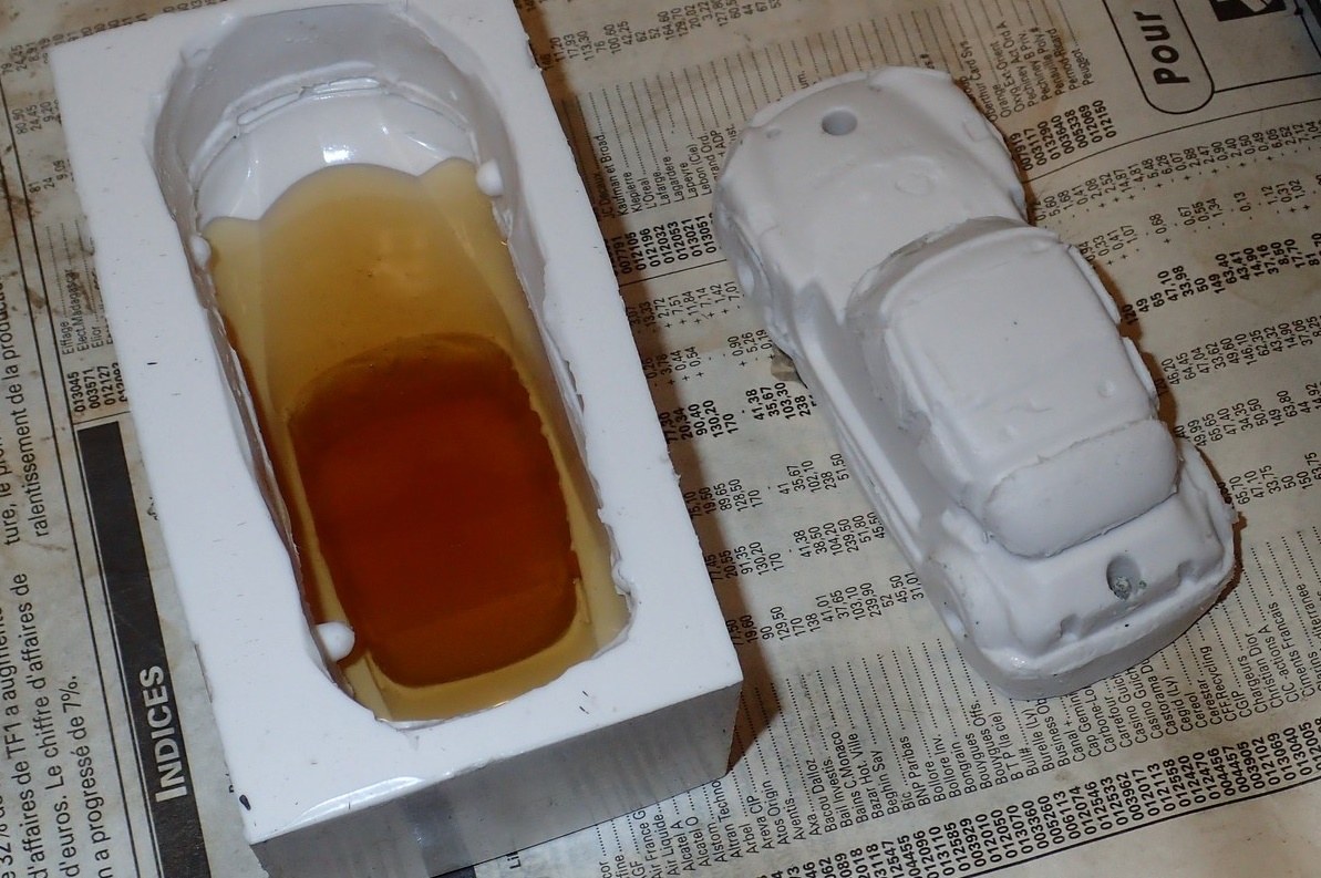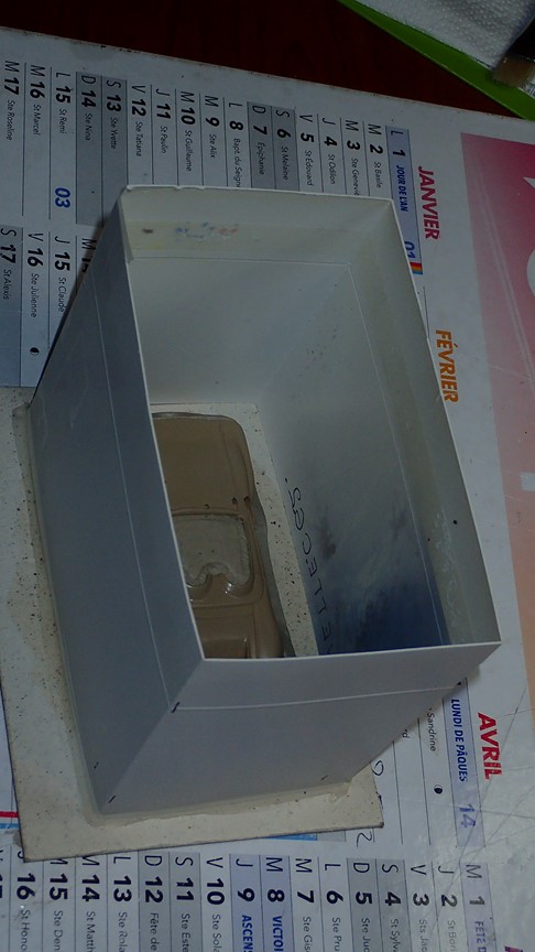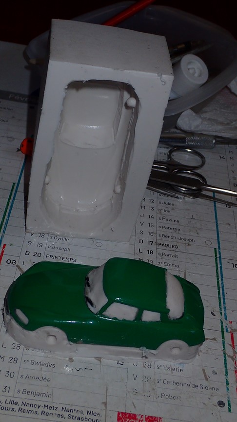 François attend la mise sur roues .... ça va venir, sois tranquille .... pour l'instant la suite c'est ça : - retiré momie, le chrome est très bien. - pose 2è support bavette : carré de 1 mm - 1 passe noir satin Humbrol au pinceau, sous l’AV et le dessous du bloc phares Maintenant c'est François qui s'y colle. De nouveau le travail d'équipe est en marche .... Donné à Nico la carrosserie (peinte !) pour que François la moule pour JP. Demandé de mouler avec les EV. Prévenu que le toit est un mille feuille très fragile, je croise les doigts ….. piukinen Petit travail du soir; le coffrage sèche! Coulée demain matin. @piukinen Bon sang que ça fait plaisir de voir son travail dans la plastiline au réveil ..... J'adore ta façon de préparer tes moules François, c'est propre, c'est net, ça sent le travail sérieux. Pas étonnant que tu aies de si bons résultats. D'ailleurs je m'en rends compte avec la R4 de Collet. Une question me vient : pourquoi ta boite est-elle si haute ? JP va être surpris quand il va revenir ..... et content j'espère ..... piukinen tout simplement car je passe mes moules à la pompe à vide pour débuller un max; et donc ça expanse beaucoup. Allez, je vais couler , je boirai le café après! voilà l'installation; au café maintenant! @piukinen Une première pour moi François, je n'avais encore jamais vu à quoi ressemblait l'émulsion après dégazage. Effectivement il vaut mieux prévoir large, ça je le savais au vu de moules prévus pour. Impressionnant ! Merci pour ces images plus que parlantes. Bon, le café a dû t'empêcher de dormir alors ..... tout ça s'annonce super bien, ce que je suis pressé de voir maintenant c'est la sortie de moule du proto .... Beau travail François Les roues tu fais comme moi, tu mets le plan de joint en dessous pour ne pas qu'il gène en cas de léger désalignement entre les deux parties du moule, sauf que mes moules ne sont pas aussi parfaits. Si je devais m'y remettre je saurai sur qui prendre exemple ..... piukinen @ balivernes démoulage OK, pas de bobo, un bon dégraissage s'impose. Pour le coulage: 1:je vais essayer de remplir le moule (pas à fond!) et de descendre le contre moule (comme les moules de petit proto) 2:ou de faire mes trous de remplissage avec un emporte-pièce au niveau des puits de vissage (c'est ma méthode, coulage avec entonnoir) et éventuellement ajouter quelques évents. 3:essayer de remplir le dessus du moule et passer à la pompe (ça me laisse souvent des bulles dans les bas de caisse) Je crois que les pros faisaient comme ça , mais avec une pompe très puissante et des évents découpés au cutter sur les côtés. @piukinen Bravo François, merci d'avoir préservé le proto. J'espère que j'arriverai à récupérer au moins le vert, le reste c'est pas grave. à suivre ..... |