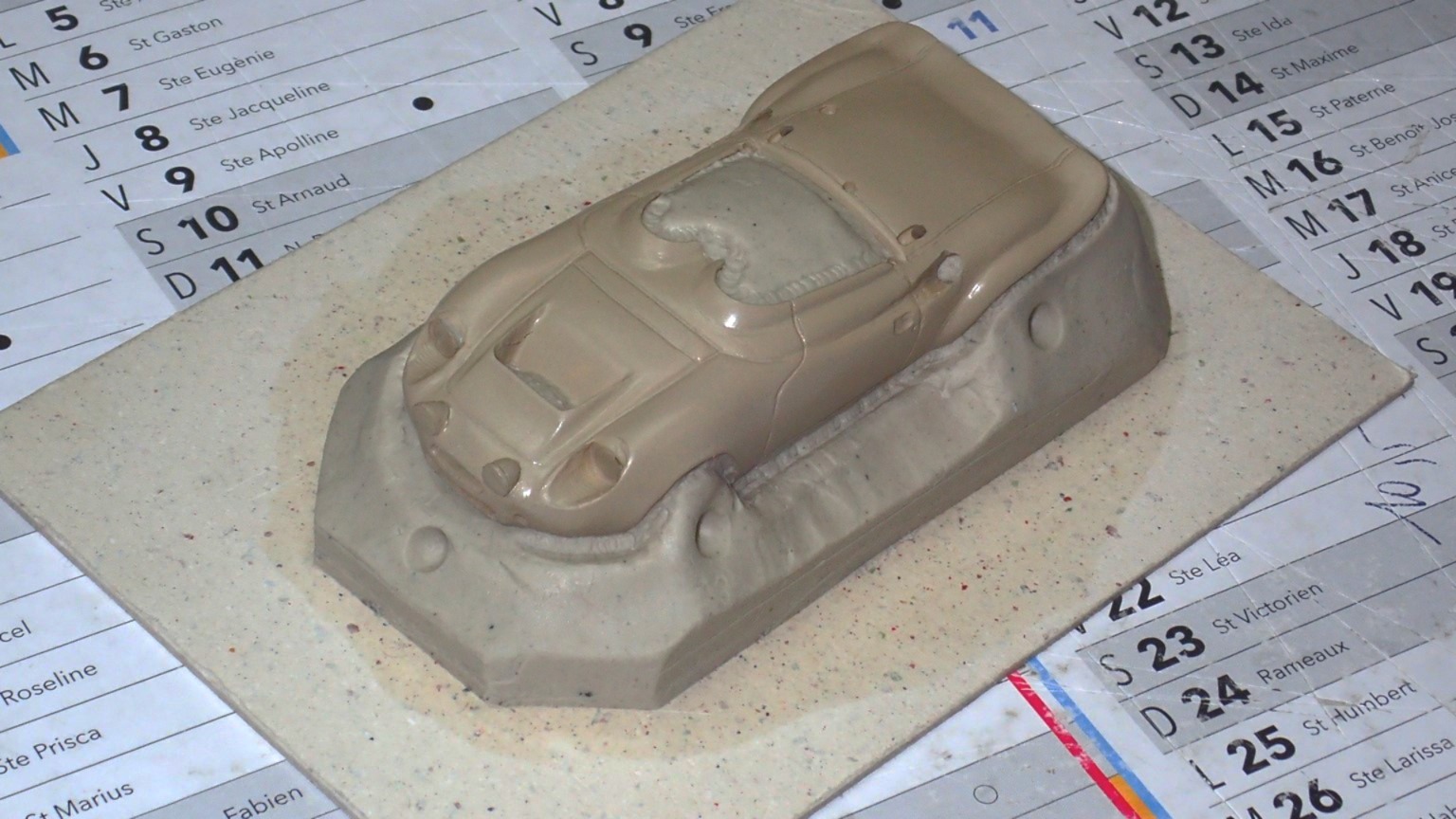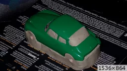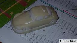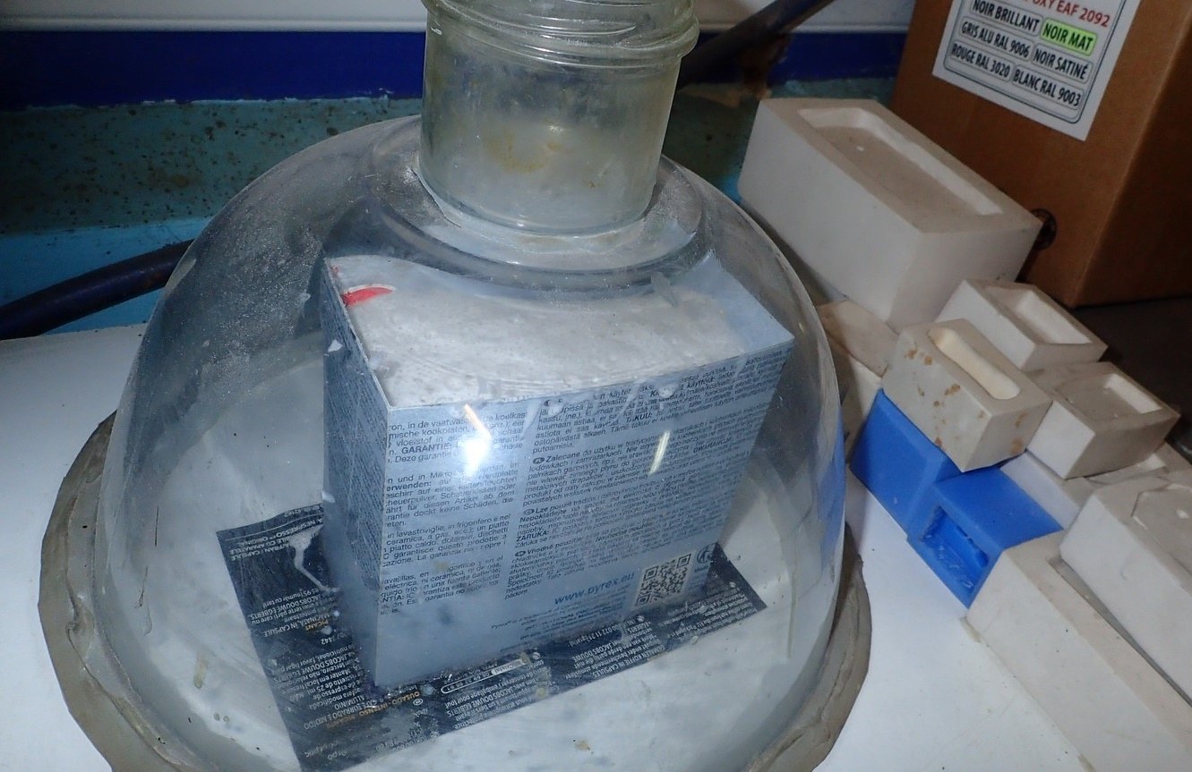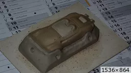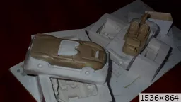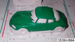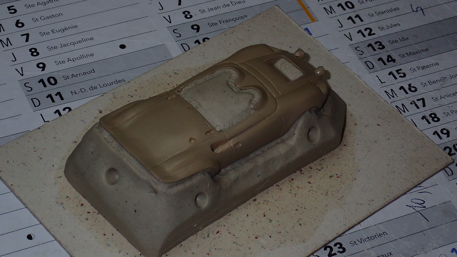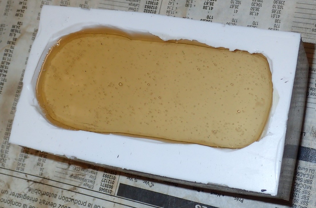 François attend la mise sur roues .... ça va venir, sois tranquille .... pour l'instant la suite c'est ça : - retiré momie, le chrome est très bien. - pose 2è support bavette : carré de 1 mm - 1 passe noir satin Humbrol au pinceau, sous l’AV et le dessous du bloc phares Maintenant c'est François qui s'y colle. De nouveau le travail d'équipe est en marche .... Donné à Nico la carrosserie (peinte !) pour que François la moule pour JP. Demandé de mouler avec les EV. Prévenu que le toit est un mille feuille très fragile, je croise les doigts ….. piukinen Petit travail du soir; le coffrage sèche! Coulée demain matin. @piukinen Bon sang que ça fait plaisir de voir son travail dans la plastiline au réveil ..... J'adore ta façon de préparer tes moules François, c'est propre, c'est net, ça sent le travail sérieux. Pas étonnant que tu aies de si bons résultats. D'ailleurs je m'en rends compte avec la R4 de Collet. Une question me vient : pourquoi ta boite est-elle si haute ? JP va être surpris quand il va revenir ..... et content j'espère ..... piukinen tout simplement car je passe mes moules à la pompe à vide pour débuller un max; et donc ça expanse beaucoup. Allez, je vais couler , je boirai le café après! voilà l'installation; au café maintenant! @piukinen Une première pour moi François, je n'avais encore jamais vu à quoi ressemblait l'émulsion après dégazage. Effectivement il vaut mieux prévoir large, ça je le savais au vu de moules prévus pour. Impressionnant ! Merci pour ces images plus que parlantes. Bon, le café a dû t'empêcher de dormir alors ..... tout ça s'annonce super bien, ce que je suis pressé de voir maintenant c'est la sortie de moule du proto .... Beau travail François Les roues tu fais comme moi, tu mets le plan de joint en dessous pour ne pas qu'il gène en cas de léger désalignement entre les deux parties du moule, sauf que mes moules ne sont pas aussi parfaits. Si je devais m'y remettre je saurai sur qui prendre exemple ..... piukinen @ balivernes démoulage OK, pas de bobo, un bon dégraissage s'impose. Pour le coulage: 1:je vais essayer de remplir le moule (pas à fond!) et de descendre le contre moule (comme les moules de petit proto) 2:ou de faire mes trous de remplissage avec un emporte-pièce au niveau des puits de vissage (c'est ma méthode, coulage avec entonnoir) et éventuellement ajouter quelques évents. 3:essayer de remplir le dessus du moule et passer à la pompe (ça me laisse souvent des bulles dans les bas de caisse) Je crois que les pros faisaient comme ça , mais avec une pompe très puissante et des évents découpés au cutter sur les côtés. @piukinen Bravo François, merci d'avoir préservé le proto. J'espère que j'arriverai à récupérer au moins le vert, le reste c'est pas grave. à suivre ..... |