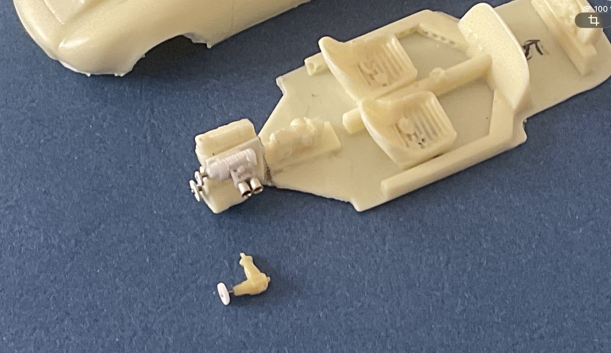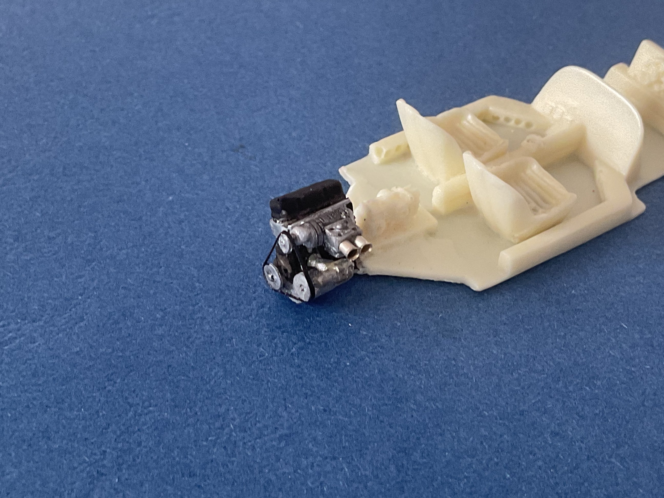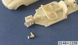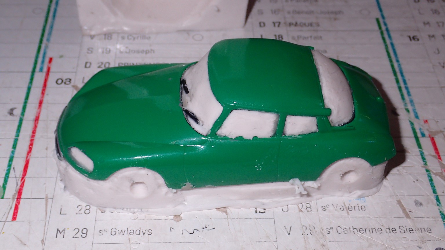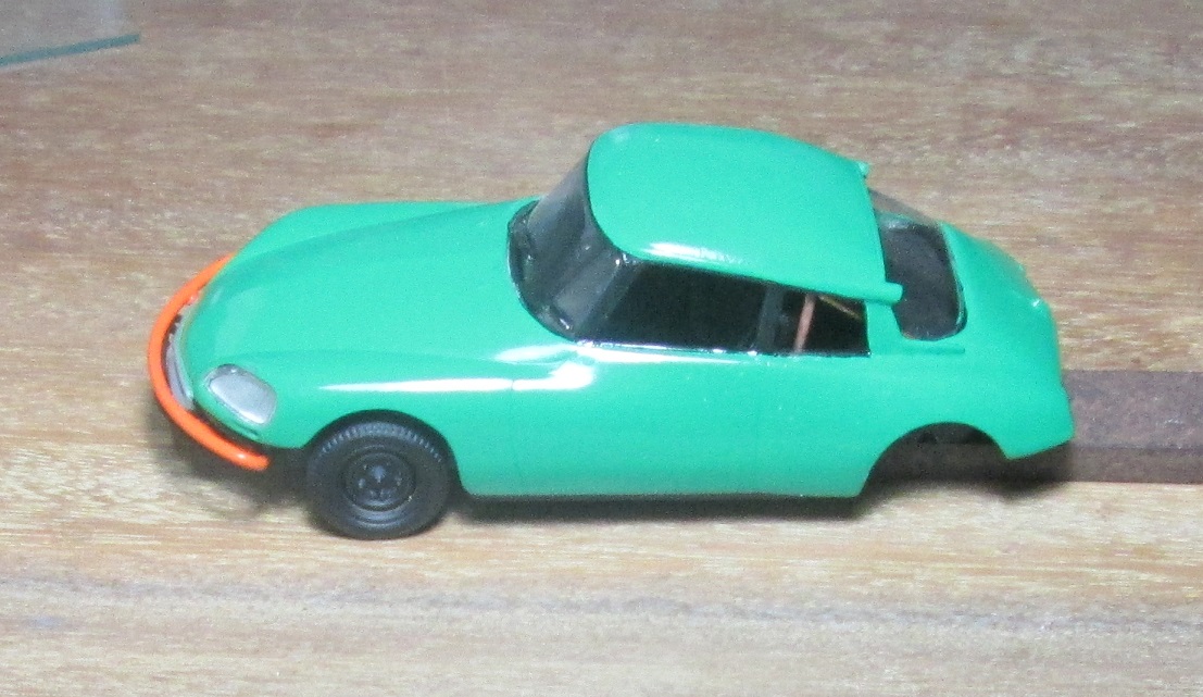 De mon côté, en ce moment c'est la diète. Pas fait grand chose, en tout cas rien de bien intéressant. Alors je vais me contenter de faire avancer un peu l'histoire de la DS verte .... Prise de vue ass pour voir la relation vert / noir à ce stade - mélange Humbrol au pinceau sur int carrosserie sauf à l’AV : attente de faire le point sur les phares et les bavettes + traverse d’auvent (avec EV) et bord lunette - 1 passe pinceau même mélange sur le dessus du châssis (plancher, sièges et tablette) : bcp mieux. Mais attention : pas de passes ultérieures à la bombe (pas compatible) Ce mélange de noirs est très bien. - présentation bloc phares complet : rentre bien. - le dessous du bloc phares donne une finition suffisante (sera noir) - essai mep pare-buffle : ne pourra pas se faire bavettes en place => seront posées après Du travail pour obtenir un bon ajustement de tout ça ! - préparer support 2è bavette (G) - arceau orange => obligé d’être complet (sur certaines photos on dirait que la partie AV est noire : ? => si c’est le cas je scrappe l’avant) - peinture calandre : ACE metallic chrome avec momie classique à suivre ..... |