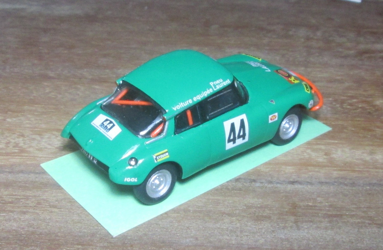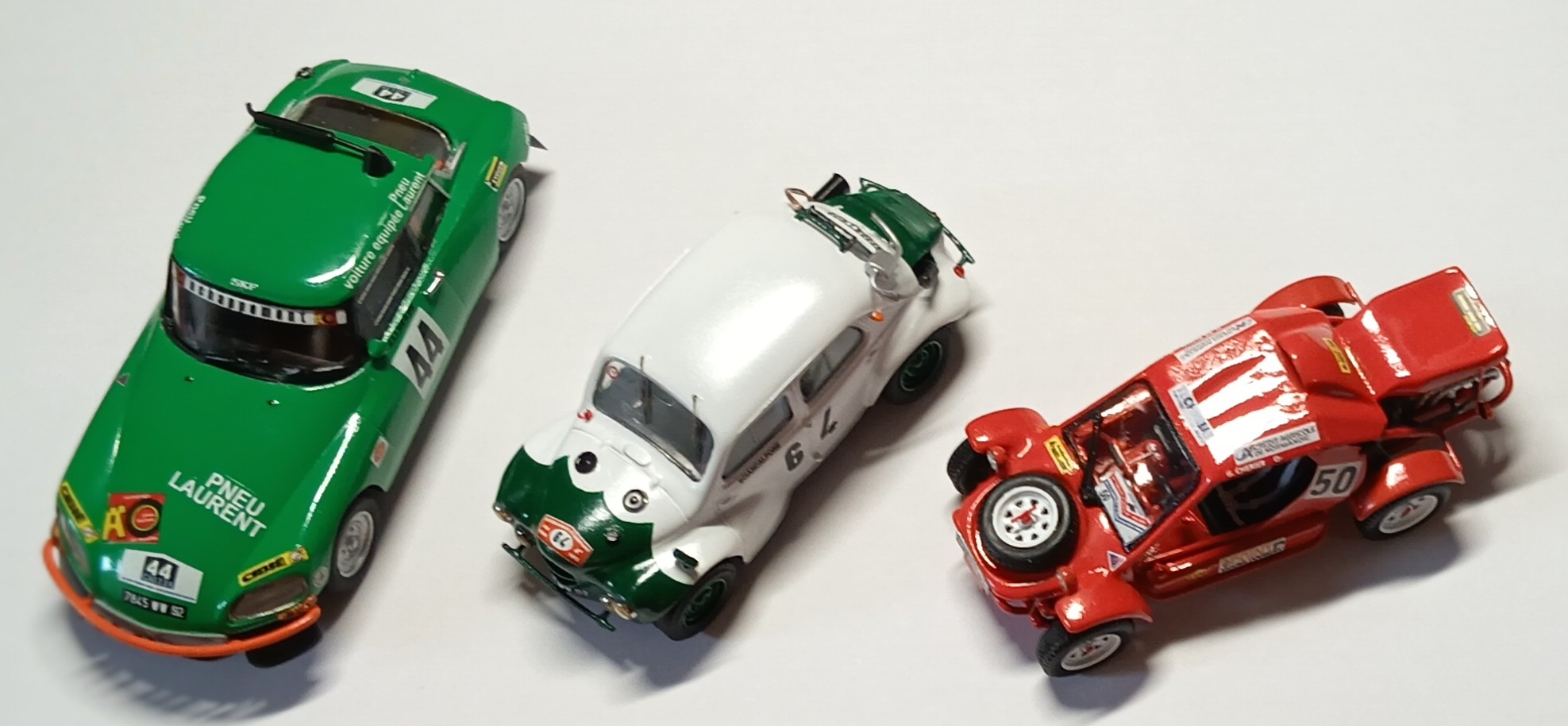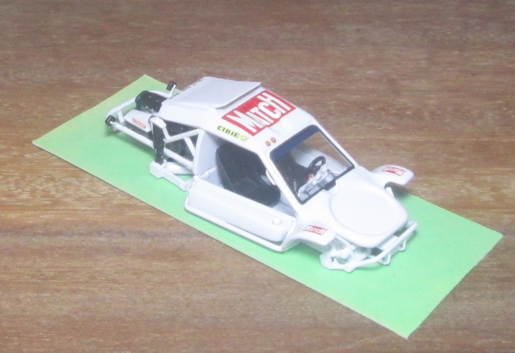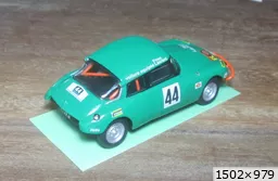 et donc ..... Vitre de porte : - fait 2 images de la trappe en décal incolore - pose du décal sur la vitre - pose des décals des glissières (planche de Toni) La pose des vitres latérales a été une galère complète. Je passe sur les nombreux essais réalisés. Vous l'avez compris depuis longtemps je suis nul à ce jeu là. J'obtiens : - pose des décals que j’ai, Ce qui donne : - mep clignos AV (Ultra Glue) - prépa bavettes AV (or CCC) : ok à blanc - mep feux rouges (Ultra Glue) Echappement : - échappement : rond pris ds grappe de kit Ø 2 env, percé aux extrémités Ø 1 mm // rond EG Ø 0,8 mm pour sortie et raccord avec descente // perçage 2 trous Ø 0,7 mm pour les supports Ø 0,5 mm. Collage Tamiya. - sortie et intermédiaire : EG Ø 0,8 mm - descente inter : boa admission Sunhill (Ø env 2 mm) percé à 1 mm côté tube intermédiaire - perçage pavillon : Ø 2 mm. Repérage du bon XY avec un moulage restant de François : le boa passe entre les sangles du harnais et l’arceau. - 1 passe primer grey sur échappement - bavettes noires en mylar =˃ flat black sur un bout de 10x5 cm. - 1 passe flat black sur déflecteur échappement - mep poignées (Alteco) : ok. (or CCC WM chromé). - pose filet chrome sur montants custode : pris dans PdB Colorado. Largeur 0,4 mm. Plus tard : - mep déflecteur : ok. - récup Bte à rabiots rétro style California chromé : je pourrai garder le miroir. - deep green sur le rétro : ok. - il faudra repasser du Gauzy partout après pose des derniers décals. TERMINEE sf additif décals Plus tard : - reçu additifs décals de Toni : ok - pose pilotes et chevrons : ok - Gauzy sur tte la carrosserie : ok. Les noms des pilotes (noirs) ressortent bien. CETTE FOIS ELLE EST TERMINEE Avec ses copines terminées presqu'en même temps : Voilà ! That's all folks ....... |