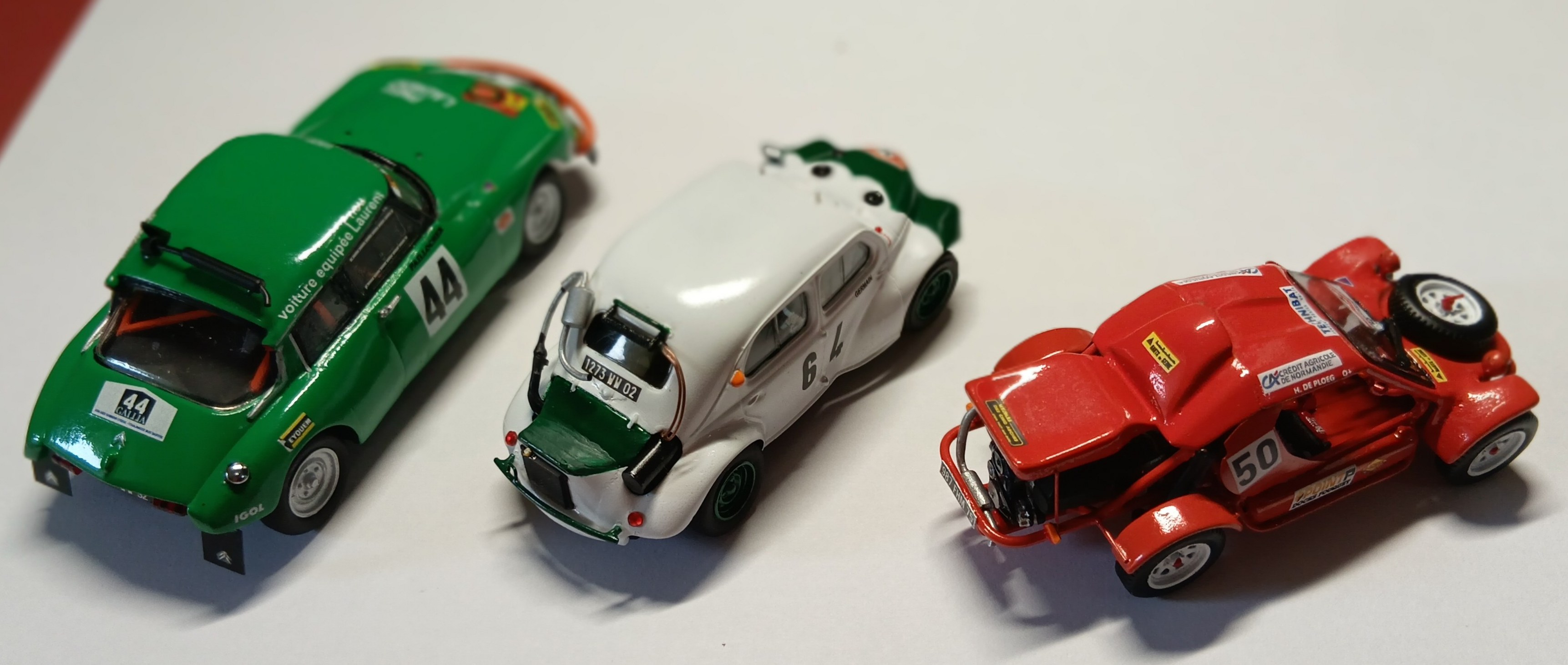 On parle beaucoup de Piukinen en ce moment ..... En attendant : Les roues d’essai VW ont fait leur temps : celles-ci sont des Citroën. => je vais essayer de monter le châssis comme ça pour voir. - point sur les roues : celles retenues devraient aller Ǿ 15.2 à 3 mm, ep 4 ou 4.7 Comme c’est une traction je pourrai mettre les plus larges à l’AV. pour voir. J'entend les puristes qui disent "il va quand même pas faire ça !" ..... - moyeu Ǿ 1.5 mm - si elles ne vont pas j’en ai 4 de Ǿ 15.7 mm ep 4.7 mm, jante WM. - mep lunette : collage SG. Gauzy pour boucher le jour. Gauzy aussi sur la vitre sur les deux faces. - mep CP ep 1.5 mm biseauté pour faire le trip sur la PdB. - finition surface pare-chocs AV - 1 passe apprêt Enzo dessus. - 1 passe pinceau orange Humbrol un peu dilué sur le pare-chocs - présenté PdB en place sous la baie de pare-brise : semble bien, je devrais pouvoir coller directement si pas de ramponeau avec le châssis. - creusé int passages de roues AV car ils dépassent de la carrosserie en Y. Pas besoin de repeindre. - prépa axe roues AV : contre perçage des moyeux à Ǿ 1.5 mm : ok Validé à 39 mm pris sur exter roues => voie 34.3 mm - idem axe roues AR : validé à 38 mm => voie 34 mm nota : seulement 1 mm d’écart sur les exter roues, soit env 43 mm en vrai : les deux essieux étaient peut-être identiques. - mep à blanc AV : ok en X,Y et Z - idem AR : roue D trop en AV, roues G trop en AR => correction sur châssis : ok - Ǿ des roues validé - mise sur roues à blanc : acceptable sans plus - fixation châssis avec ses vis : ok. - le pare-chocs orange est sec mais attendre demain pour le présenter en situation Bilan ce soir : Où est la race de la DS ???? les formes sont molles, lourdes. On dirait un crapaud. Il n’y a pas que de moi, la base est déjà comme ça. Je l’ai choisie pour le rendu des phares, j’aurais dû aller plus loin dans ma recherche. Le noir des roues ne l’avantage pas. Etat à ce stade : - dans la vitrine elle parait plus basse que les autres Rallye TT. Changer les roues ? Revoir la garde au sol ? L’assiette est conforme à ce que je voulais ..... - mep collé pare-chocs AV à suivre ..... Dernière édition le 03/03/2026 à 09:40 par balivernes, édité 1 fois |