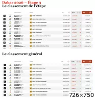 Classements https://www.dakar.com/fr/classements (Tous les classements officiels du Dakar - auto - moto - quad - SxS - camion) MOTOS AUTOS ![]() Sébastien Loeb (MC: monsieur crevaisons), déjà malheureux la veille sur le prologue, a encore connu une journée délicate avec une double crevaison ! NB: Une seconde et huit dixièmes. C’est le temps qu’il a fallu aux mécaniciens de McLaren pour changer les quatre roues de la monoplace de Lando Norris lors du Grand Prix du Qatar en 2023. Sur le Dakar les meilleurs équipages changent une roue en moins de 2' ! Vainqueur du Dakar 2025, Yazeed Al Rajhi est le grand perdant du jour. Il a écopé de 16 minutes de pénalité en raison d'un point de passage manqué et d'un excès de vitesse. Peut-être relégué en porteur d’eau.... Dernière édition le 05/01/2026 à 00:20 par cygoris, édité 3 fois |
