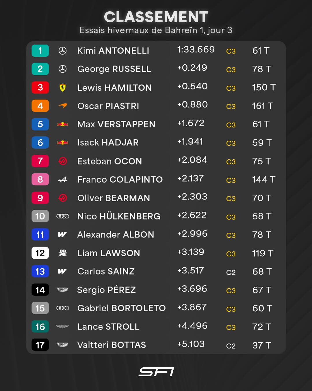 Même si les tests ne veulent rien dire, l’année dernière Sainz et Leclerc avaient fait 1 et 3 je crois durant les tests… RB semble au top niveau perf, surtout en ligne droite (super motricité). Ferrari semble fiable. Aston semble loin, mais avec l’espoir de faire une « McLaren ». |