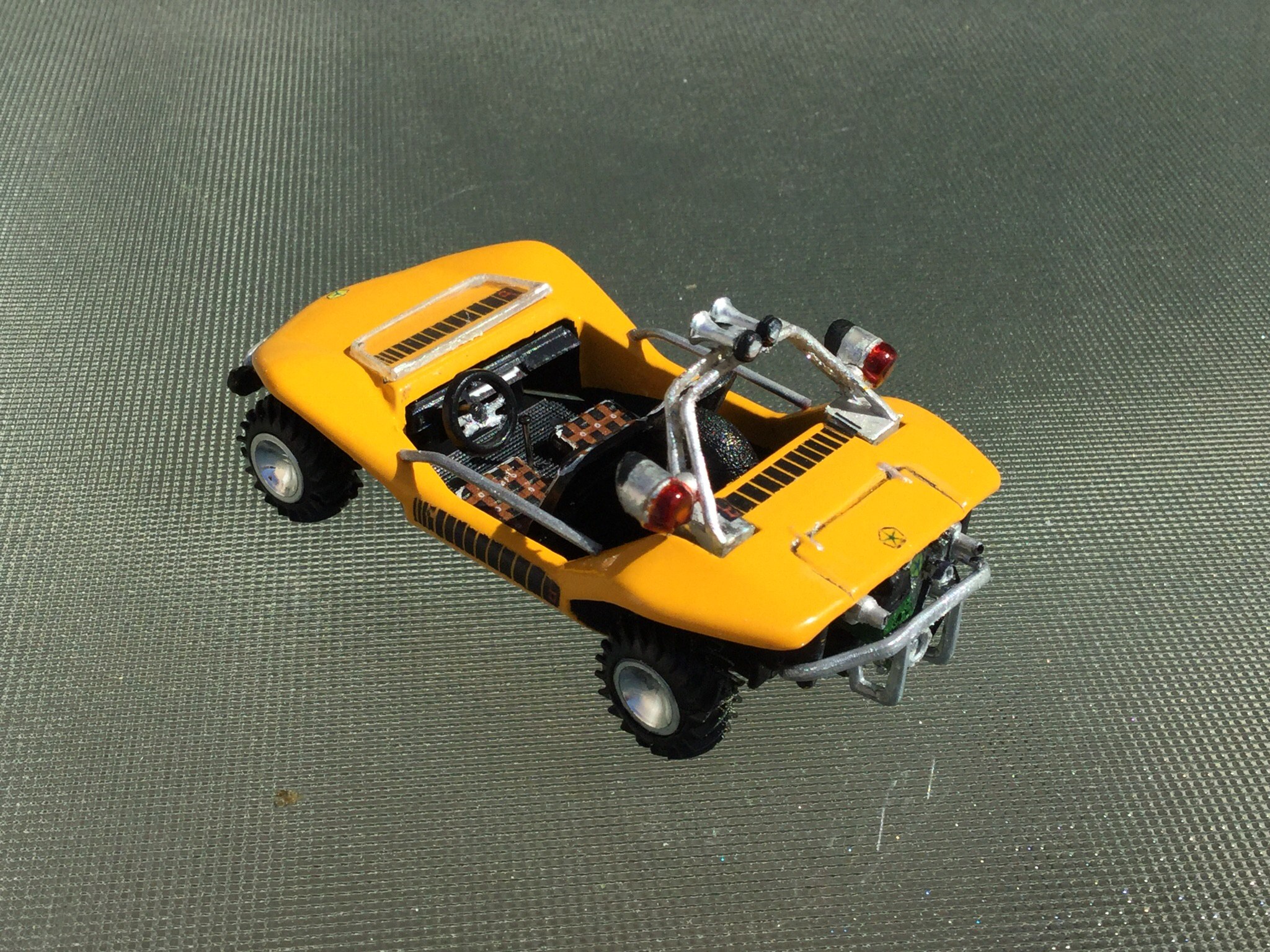 Bonjour, Suite à l'achat du Manx du record de la Baja (1966) détenu alors par une moto (Schuco) j'ai eu envie de réunir sur une photo mes Manx (deux sont encore en cours : celui de Pike's Peak et celui de James Garner à la Stardust 68. - les 3 de gauche c'est le même, le tout premier Manx (châssis tubulaire avant de reprendre la plateforme Cox). Avec la guitare en 1964 (balade de Bruce Meyers avec ses amis en basse Californie) arts design creations 03B réalisé à partir du 16B, le jaune, seuls les phares sont communs); à côté dans son état actuel après restauration (Spark) et avec les bidons verts au record absolu sur les 1600 kms de traversée de la basse Californie (Schuco). La Baja, au Mexique, donnera son nom à la Baja 1ooo à partir de 1968 qui est aujourd'hui encore l'une des plus dures et réputées courses de ce type. - avec le n°10 un autre Manx tubulaire qui remporte la toute première course de désert, la Mexican 1ooo, 1600 kms de pistes épouvantables entre Ensenada et La Paz. Cette course deviendra la Baja 1ooo ensuite. - en jaune le premier Manx sur plateforme Cox, en 1967. Douze de ce type seront construits avant le Meyers Manx que nous connaissons tous. C'est aussi le premier que j'ai fait (adc16B) |
