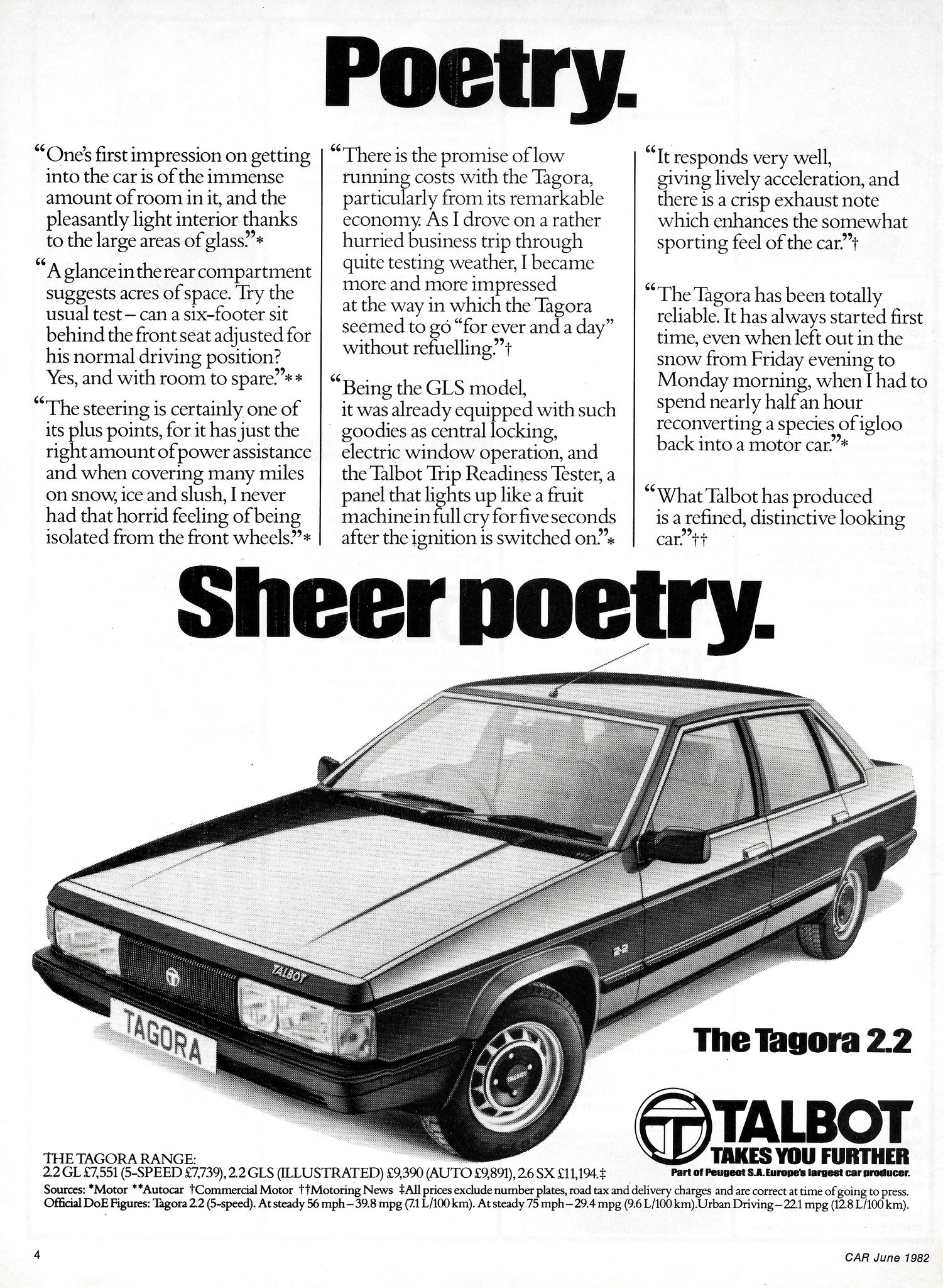 Citation de grd : « Je suis étonné de l'intérêt suscité par la Tagora. Comme il se disait à l'époque : "s'il en avait été produit davantage, on aurait pu parler d'une série limitée". Ou encore : "quand j'en vois une, j'allume un cierge". ... » Production: 1980 : 502 1981 : 15 687 1982 : 2 624 1983 : 1 320 Sur les 20 133 exemplaires construits ces quatre années, 1 083 furent des modèles V6 (SX), le reste fut partagé en deux parts pratiquement égales de 2,2 L essence (GL, GLS) et 2,3 L diesel (DT). @grd : |