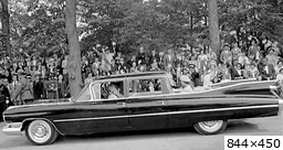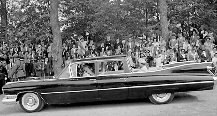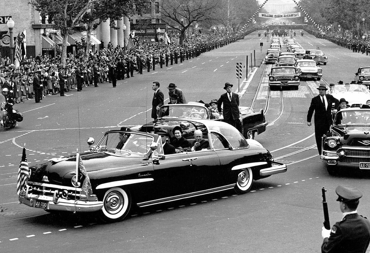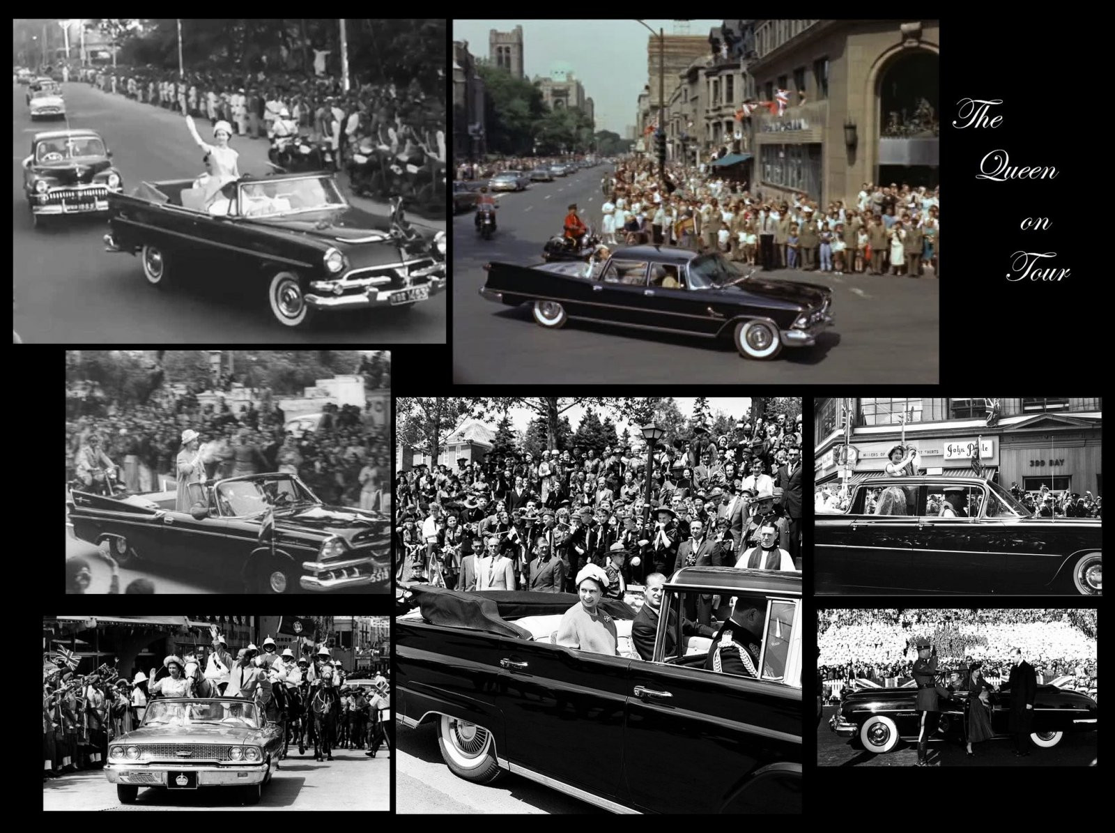 Quelques photos liées aux visites de la Reine Elizabeth à travers le monde. - En visite aux USA en 1957, à Washington, avec le président Eisenhower dans une Lincoln 1950. - Visite au Canada en 1959 (ville non identifiée) dans une Cadillac 1959: - Visite en Nouvelle Zélande dans une vulgaire Ford 1963, mais la Rolls royale suit de près au cas où ! Source : Caradisiac |