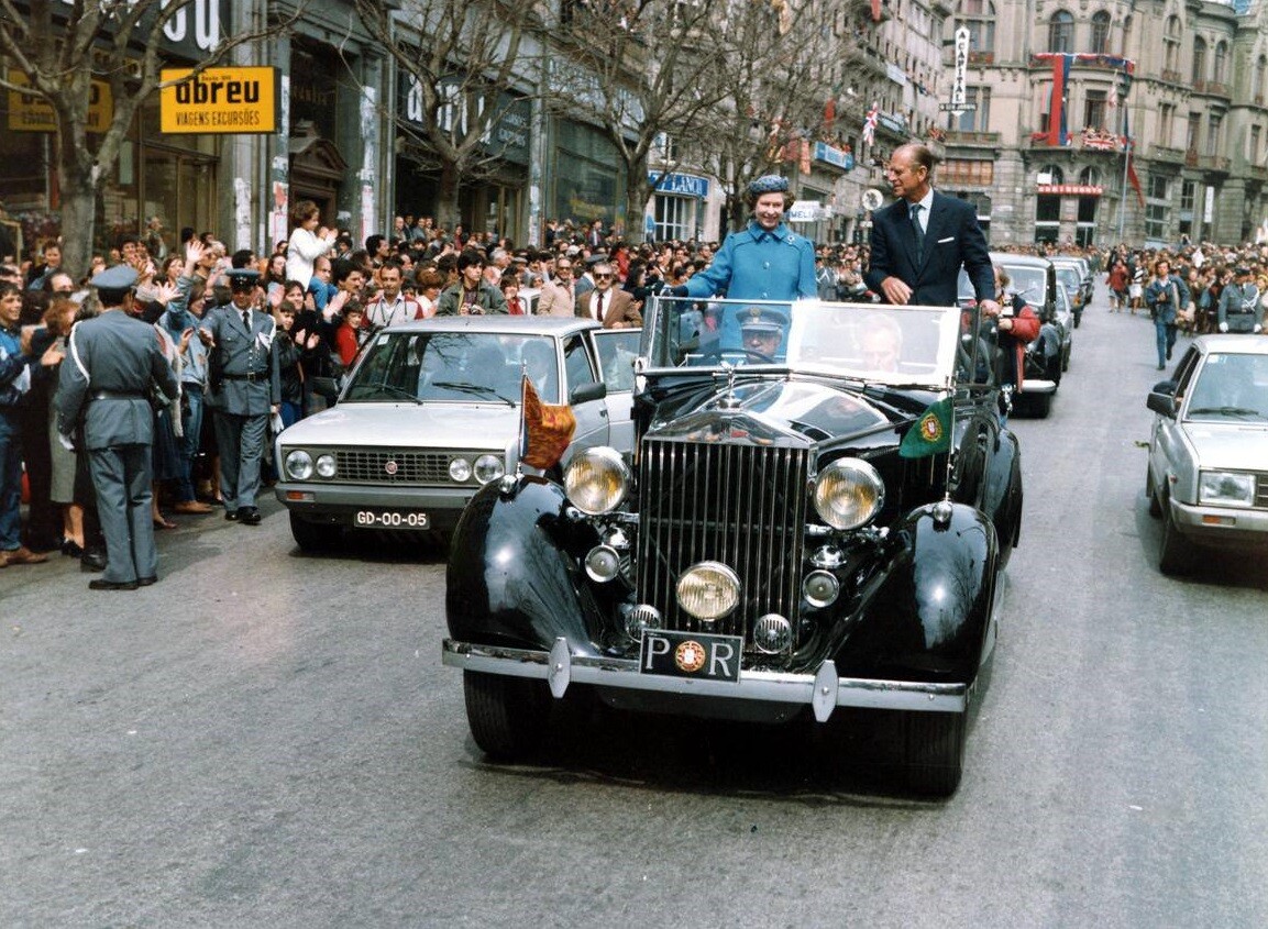 Au Portugal en 1985, à Porto, dans une Rolls-Royce Phantom III de 1937. On voit aussi une Fiat 131 Volumetrico Abarth de la police portugaise. Source : Caradisiac |