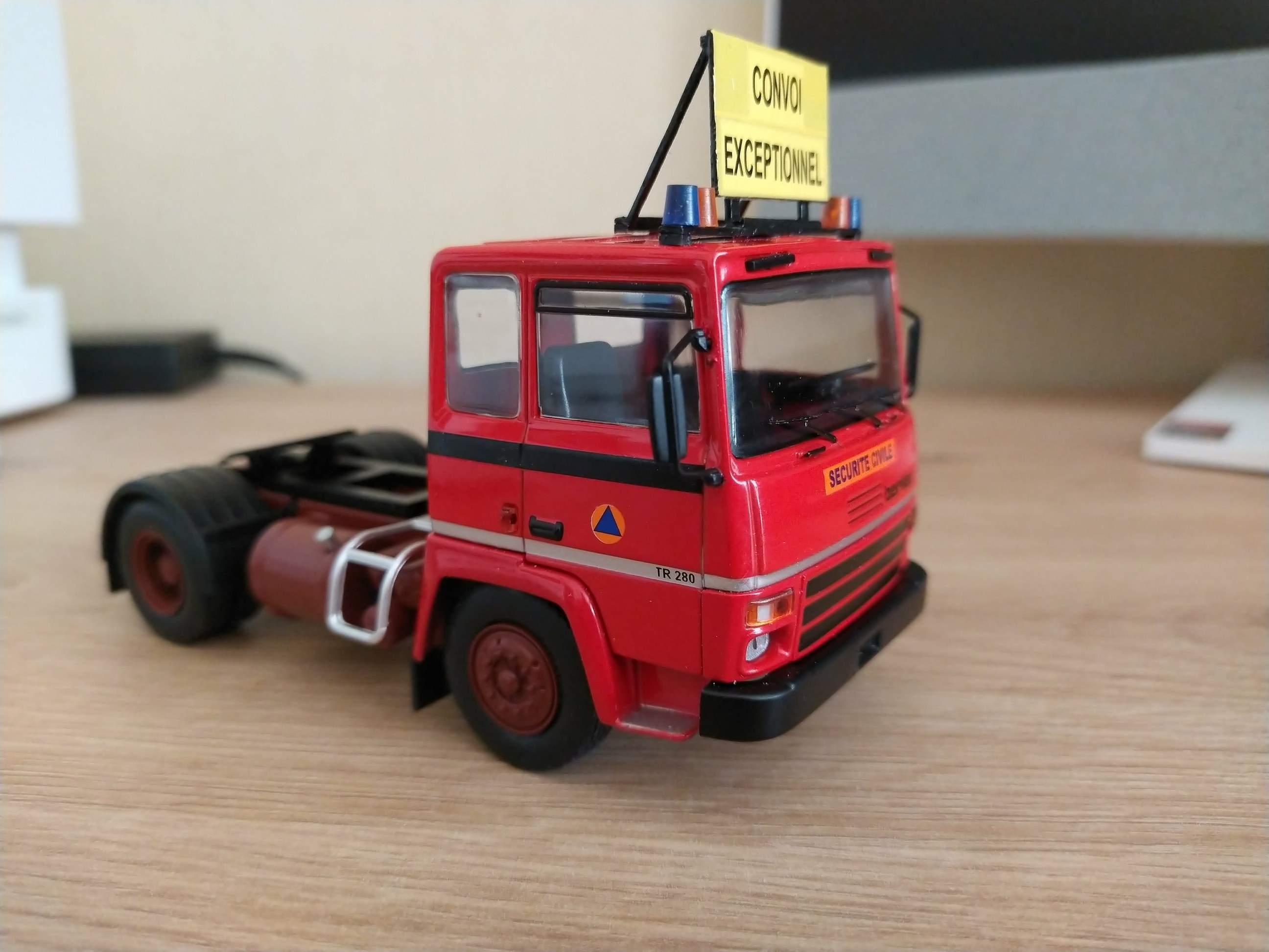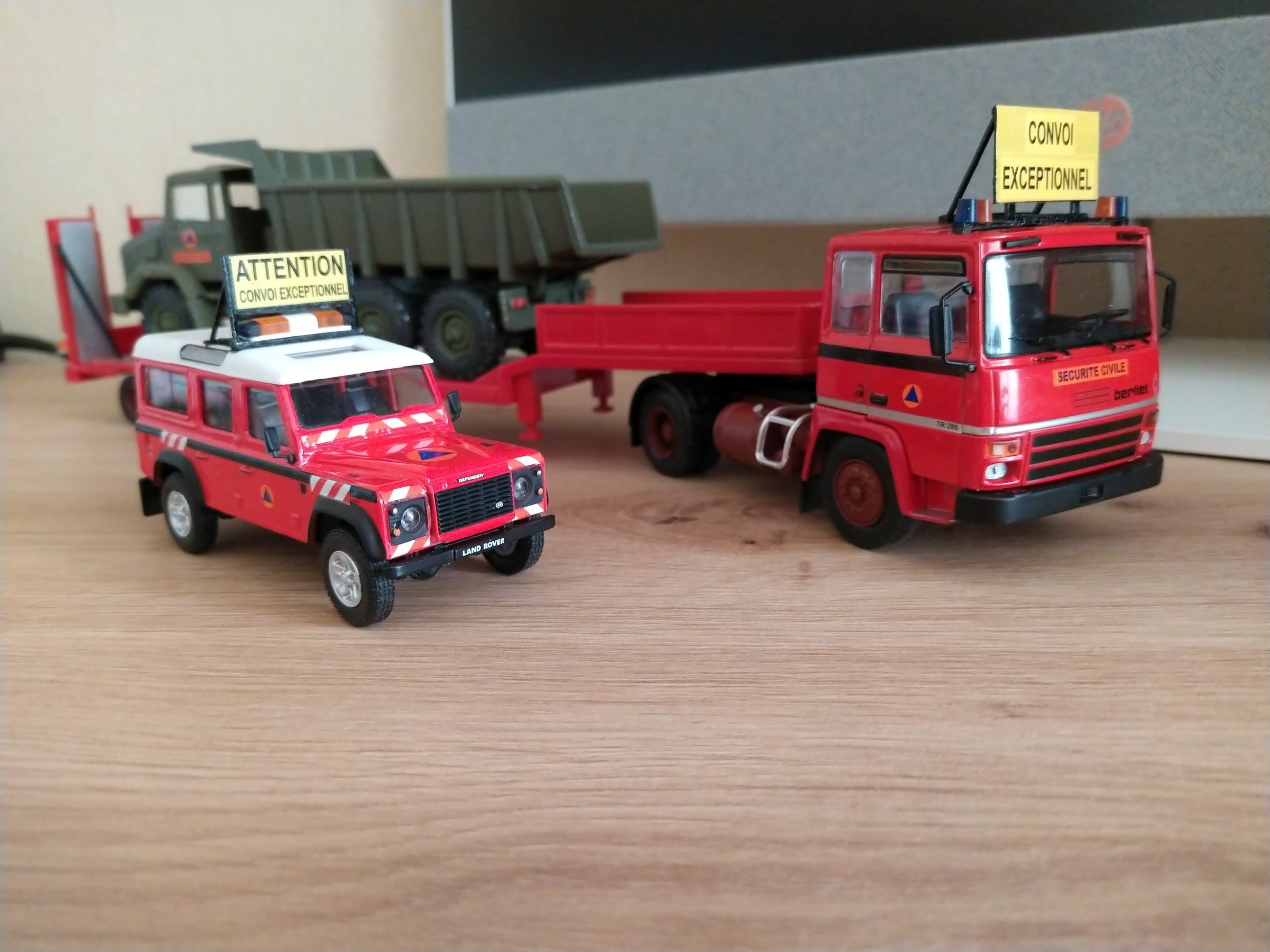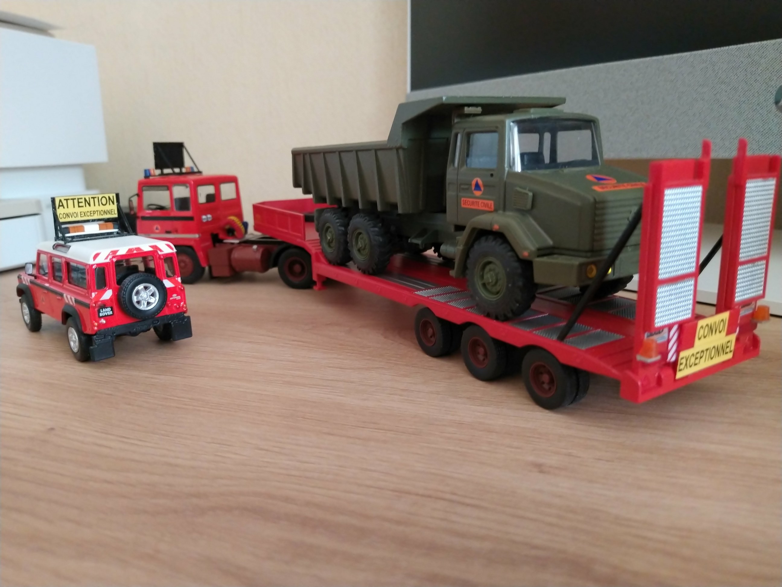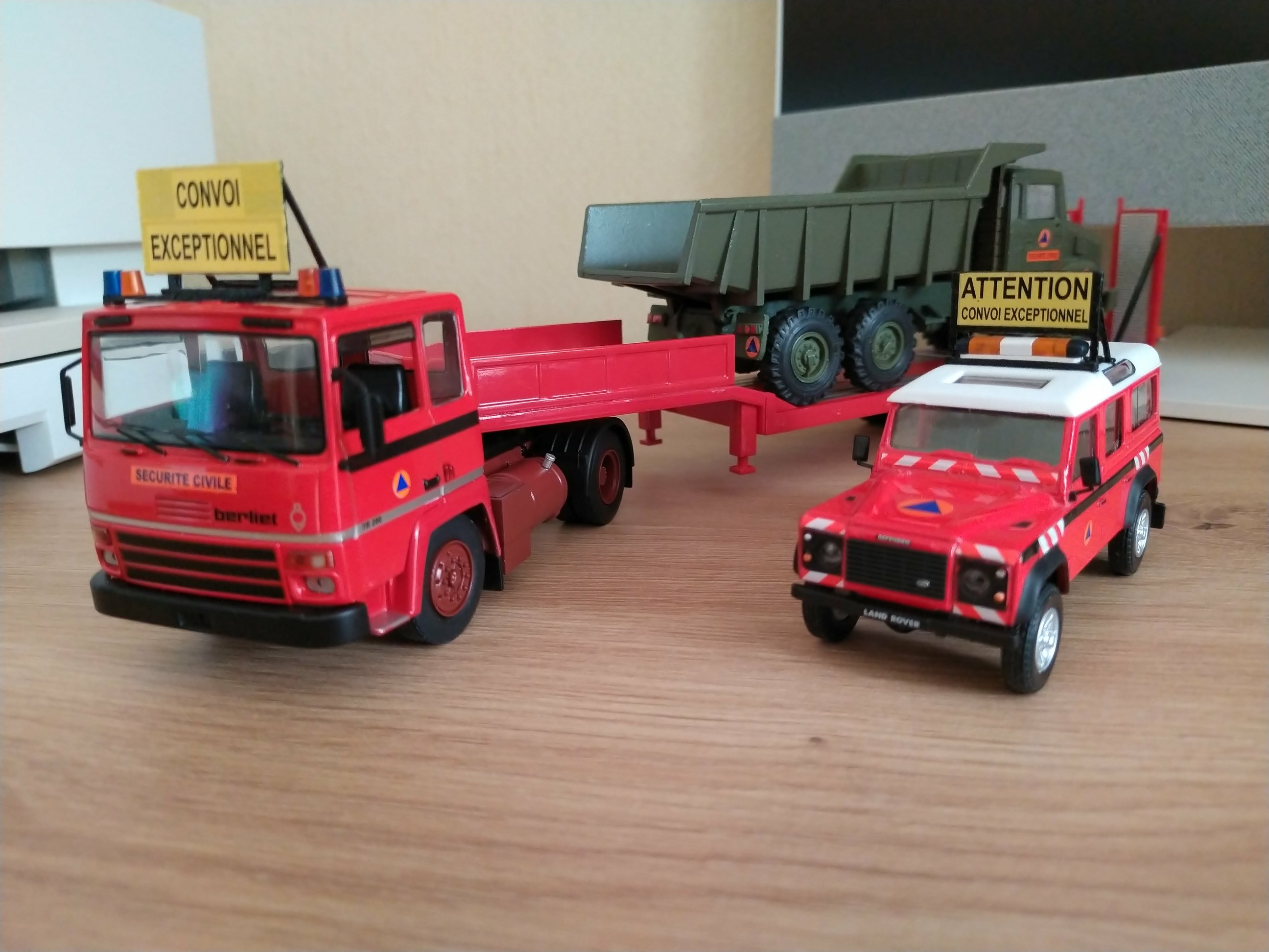 Bonjour à tous, Voici la réalisation personnelle aux couleurs de la Sécurité Civile d'un porte engin. Il est réalisé sur la base du tracteur Berliet TR 280 et sa semi remorque porte engins de chez Odéon au 1/43 ème. Travaux réalisés sur l'ensemble routier : - Réalisation du panneau "Convoi Exceptionnel" sur le tracteur. - Réalisation des barres de support des gyrophares et du panneau sur le tracteur. - Réalisation du panneau de la semi-remorque. - Réalisation des barres de sécurité des rampes d'accès de la semi-remorque. - Réalisation des supports de gyrophares de la semi-remorque. - Pose de l'ensemble des gyrophares. - Redécoration de l'ensemble. Sur la présentation, le porte engins est accompagné de son véhicule pilote sur Land Rover 110, et chargé d'un camion dumper Renault CBH 280 de couleur vert kaki. Photos du véhicule réalisé au 1/43 : ![]() ![]() ![]() ![]() ![]() ![]() ![]() |