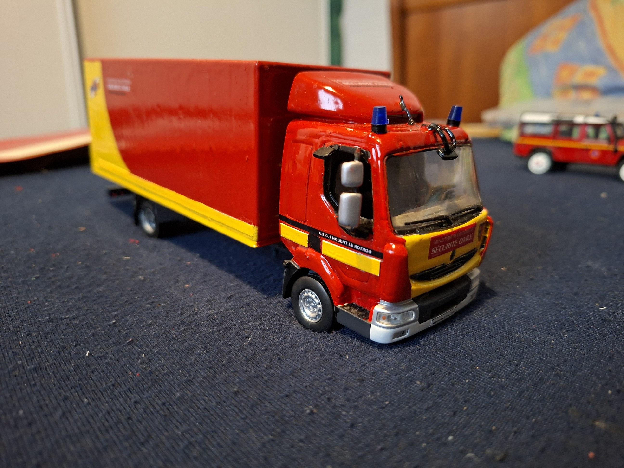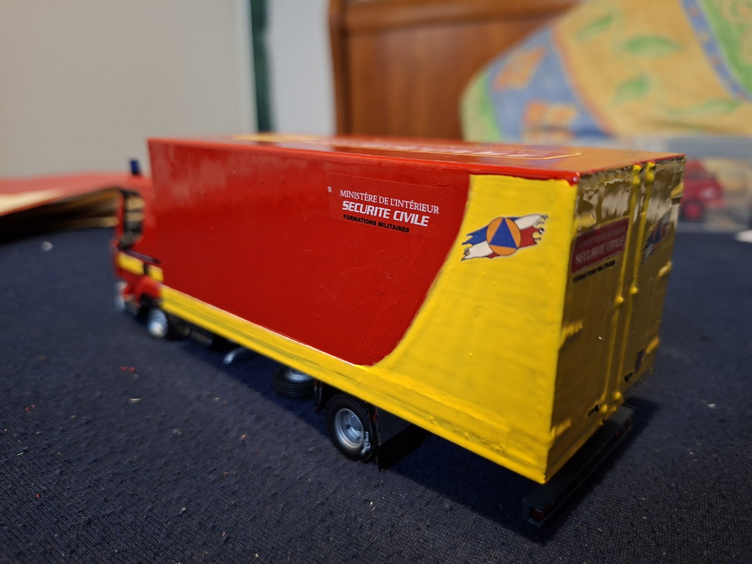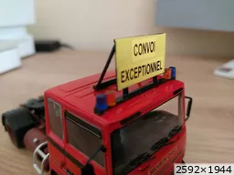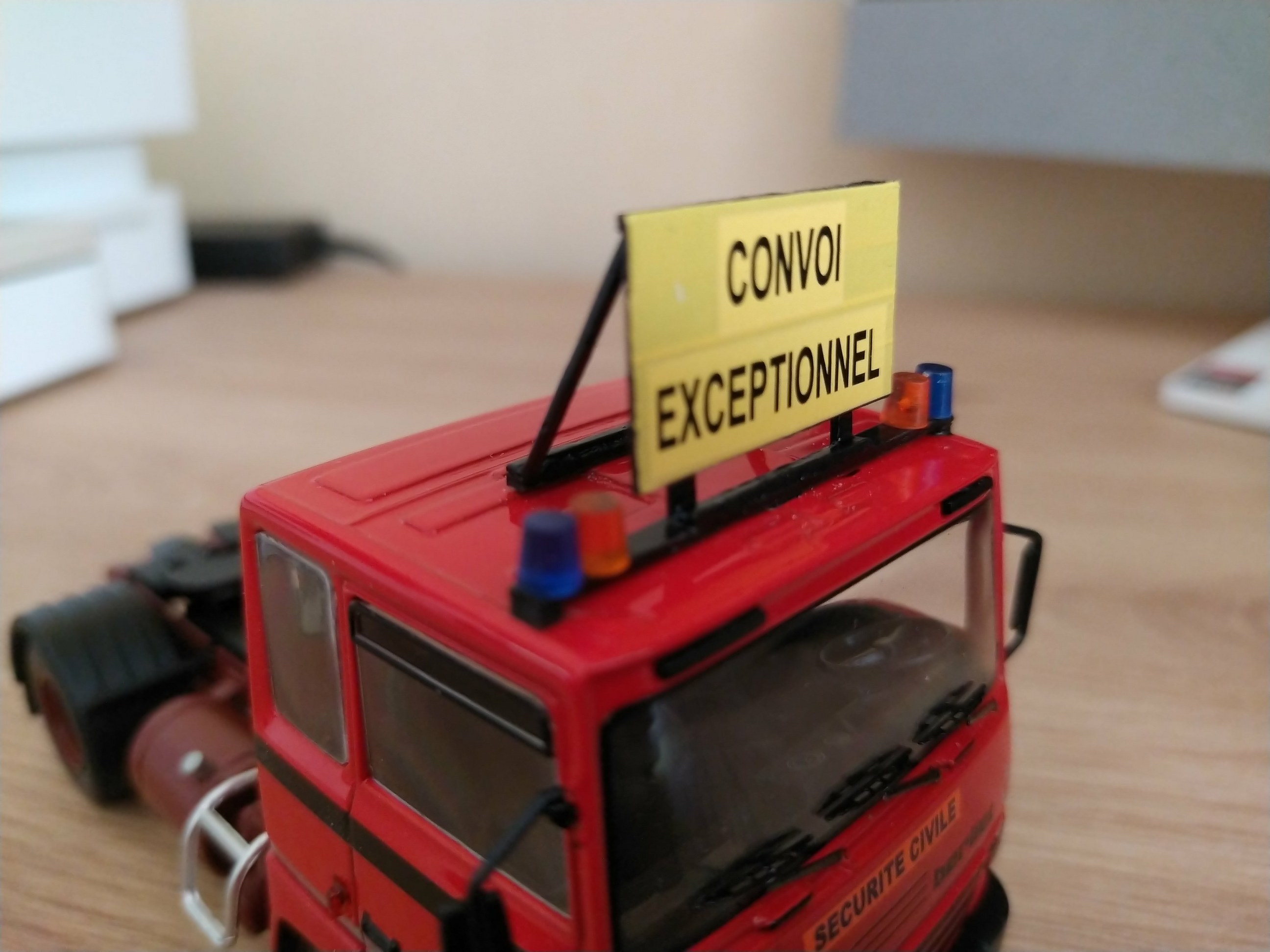 Bonjour à tous, Voici la réalisation personnelle aux couleurs de la Sécurité Civile d'un porte engin. Il est réalisé sur la base du tracteur Berliet TR 280 et sa semi remorque porte engins de chez Odéon au 1/43 ème. Travaux réalisés sur l'ensemble routier : - Réalisation du panneau "Convoi Exceptionnel" sur le tracteur. - Réalisation des barres de support des gyrophares et du panneau sur le tracteur. - Réalisation du panneau de la semi-remorque. - Réalisation des barres de sécurité des rampes d'accès de la semi-remorque. - Réalisation des supports de gyrophares de la semi-remorque. - Pose de l'ensemble des gyrophares. - Redécoration de l'ensemble. Sur la présentation, le porte engins est accompagné de son véhicule pilote sur Land Rover 110, et chargé d'un camion dumper Renault CBH 280 de couleur vert kaki. Photos du véhicule réalisé au 1/43 : ![]() ![]() ![]() ![]() ![]() ![]() ![]() |