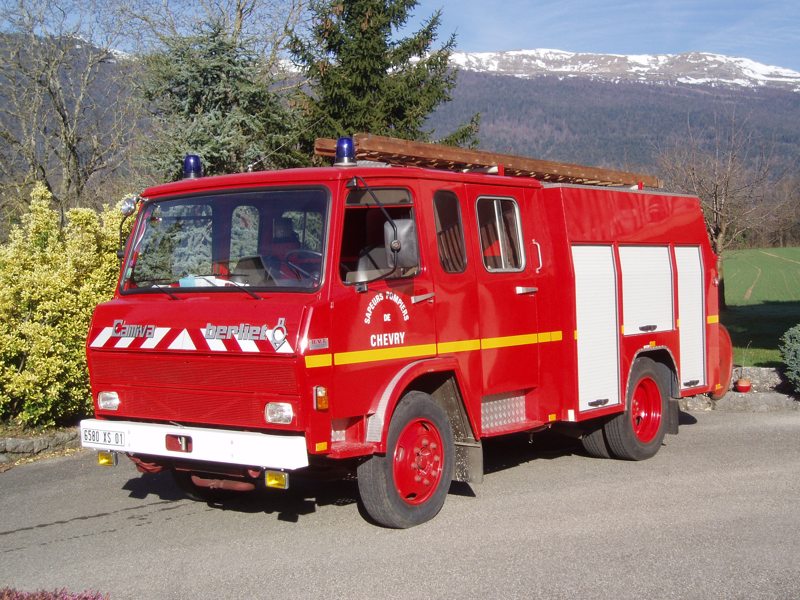 @KB6 Pour le KB6 de Chevry, petit CPI du Pays de Gex, dans l'Ain, vendu à ce CPI en 2003 par HVI, il s'agit bien d'un ancien FPTGP, de la version équipée d'une pompe de 120m3/h, fabriquée à partir de 1981, et principalement livrée à la Seine Maritime. Cette particularité se retrouve dans le coffre de toit destiné à recevoir les 5 tuyaux semi-rigides de la 2e ligne d'alimentation. Comme la plupart des KB6 du 76, il a été rénové par Jocquin, perdant ses poignées de coffres du 2e type pour un modèle spécifique Jocquin, de même que la baguette alu au dessus des coffres, mais a gagné dans la manœuvre les reprises en alliage sur l'arrière de la structure et au passage des roues arrières. A noter que la série des KB6 Camiva a été livrée, sauf option contraire choisie par le client, comme le blanc à Toulouse, avec une calandre noire encadrée de rouge jusqu'en 1976, puis entièrement rouge jusqu'en 1979 et enfin noire à partir de 1980. Cet engin de 1983 a donc vu sa calandre d'origine changée, probablement suite à un incident. |