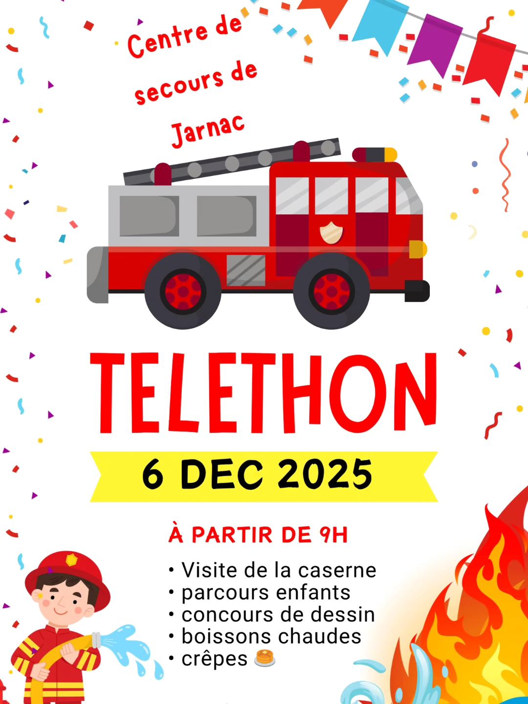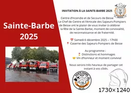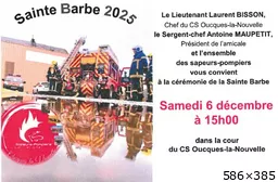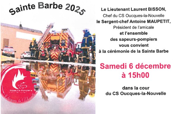 Bonsoir je suis a la recherche des dates et lieux des saintes barbes pompiers pour le Week end du 6 et 7 décembre en France. J'ai déjà le 13, 42, le 23, le 03 et quelques autres lieux par ci par la. Les animations téléthon aussi le même Week end du 6 et 7 Samedi 29 novembre : 61 : JPO des pompiers de Goufern en Auge (10h-16h). DECEMBRE : Samedi 06 décembre : 49 : JPO des pompiers de Brissac (10h-18h) |