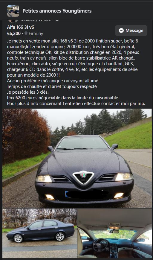 Ah oui c'est bien elle ! Bravo aux yeux de Lynx d'autotitre Jolie tentative de plus value engendrée par le fléau petit billet youngtimer Heureusement que l'acheteur se définissait comme alfiste -passionné - je la vendrai jamais bla bla bla @spilner Attention au filetage italien ,il est susceptible . Ce peut être la sonde de pression d'huile qui merdoie aussi .Elle est juste au dessus du filtre @jut20 => cote montante bientôt le million d'euros pour ton ex @Ben_92 => alors tu achetes ? Il n'est pas mimi le petit Busso Zender @spilner => je ne vois pas les liens des extraits sonores du fougueux V6 2.5 customisé ,pas serieux ça Dernière édition le 07/01/2021 à 15:22 par Klax, édité 2 fois |